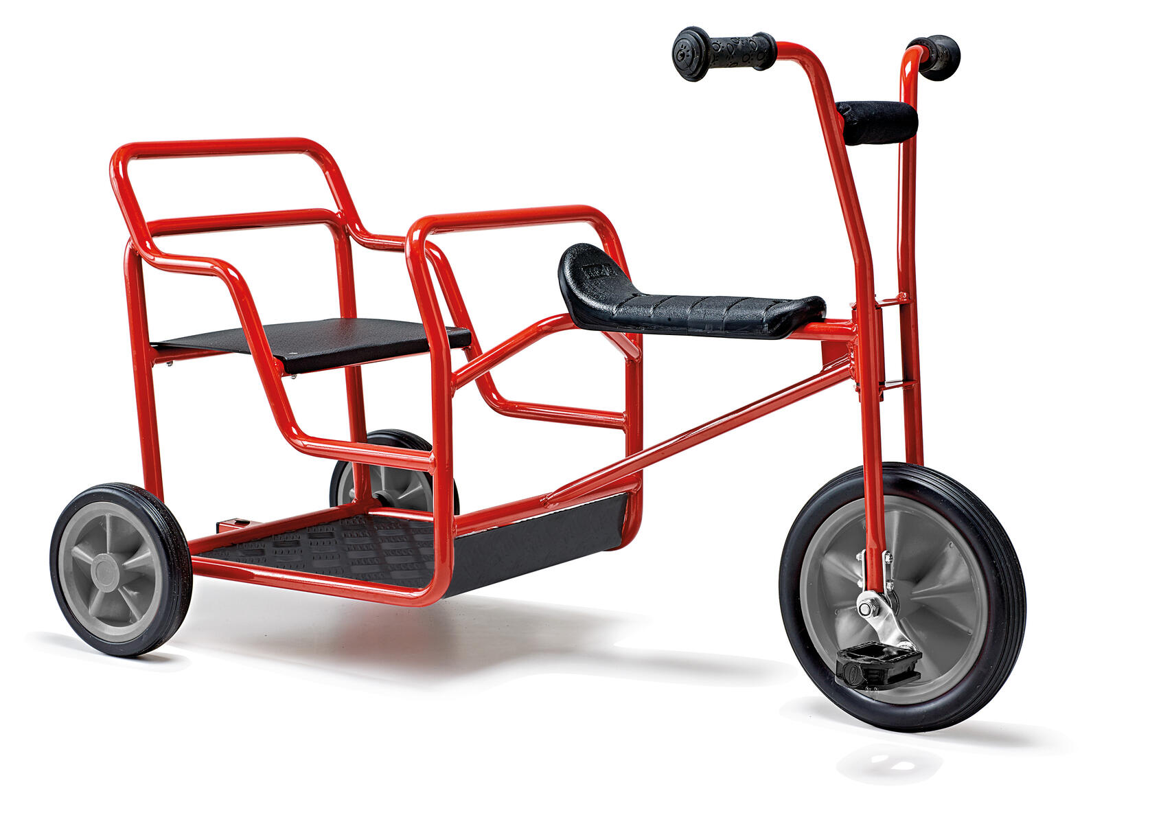 En paket med roliga cyklar med plats för extra passagerare. Utvecklar barnens sociala samspel och samarbetsförmåga. Fotplatta av slitstarkt aluminium, som är lätt att rengöra. Kullagerhjul både fram och bak. Levereras färdigmonterad. Längd: 112 cm. Bredd: 78 cm. Höjd: 71 cm. Sitthöjd: 43 cm. PVC-fri. Från 4 år.