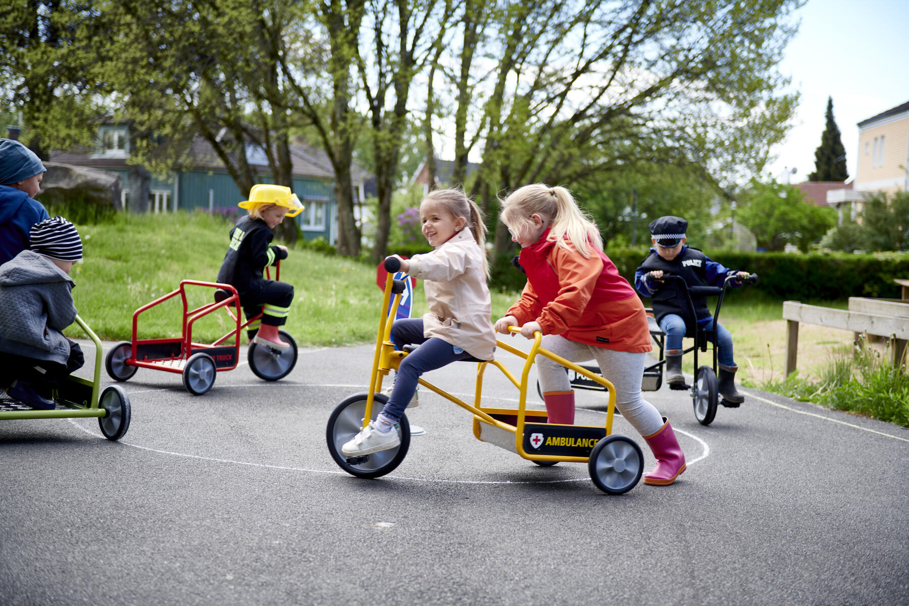 En paket med roliga cyklar med plats för extra passagerare. Utvecklar barnens sociala samspel och samarbetsförmåga. Fotplatta av slitstarkt aluminium, som är lätt att rengöra. Kullagerhjul både fram och bak. Levereras färdigmonterad. Längd: 112 cm. Bredd: 78 cm. Höjd: 71 cm. Sitthöjd: 43 cm. PVC-fri. Från 4 år.
