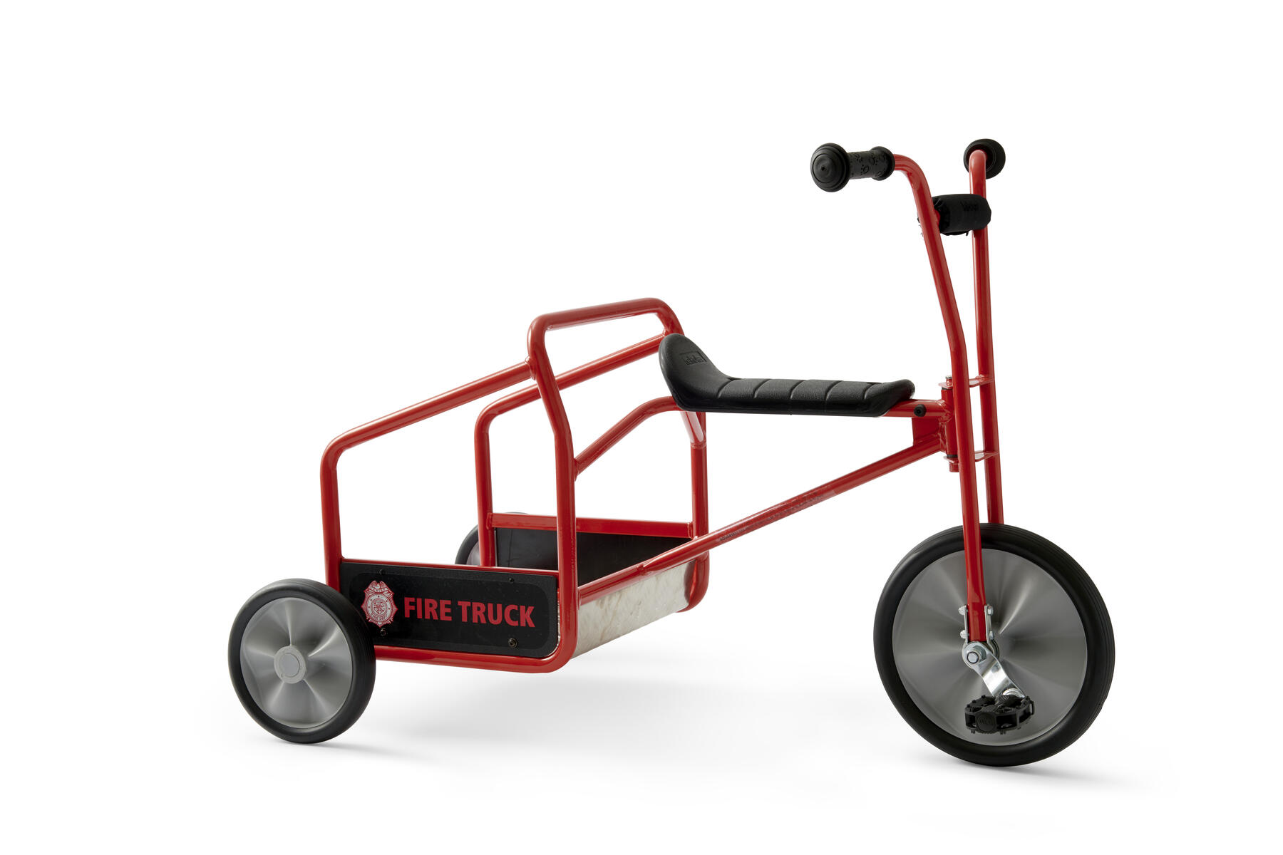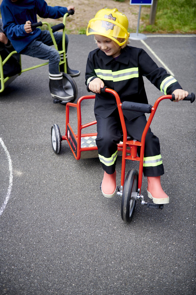 En fin, röd cykel med plats för två små brandmän på utryckning. Cykellek som utvecklar fantasi, sociala färdigheter, reflexer och motorik. Slitstark aluminiumplatta att stå på för passageraren bak. Kullagerhjul både fram och bak gör cykeln mer lättrampad. Mått: L102xB59xH71 cm. Sitthöjd: 43 cm. Levereras färdigmonterad. PVC-fri. Från 4-8 år.