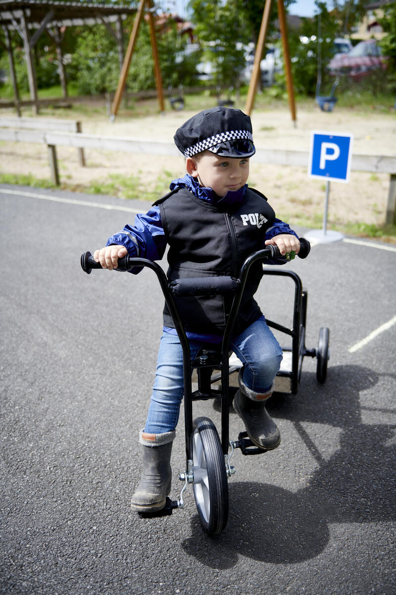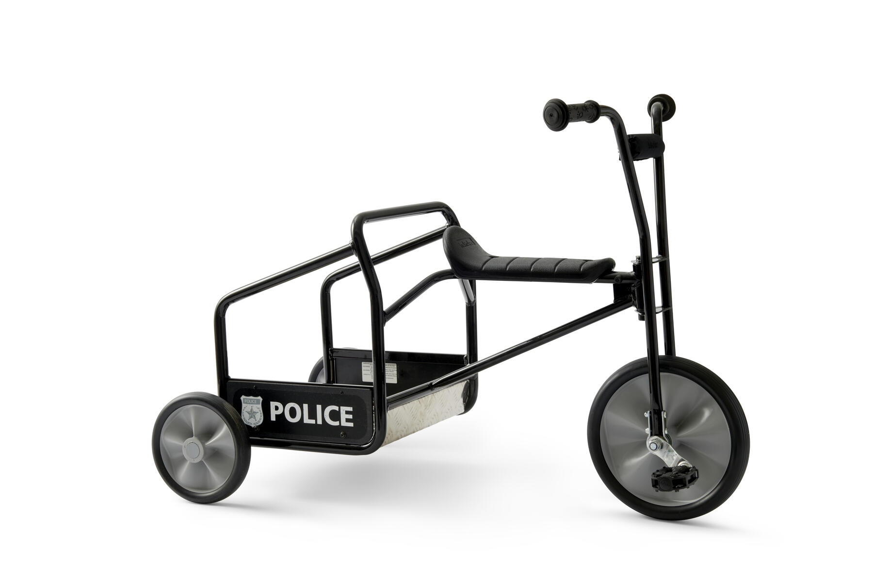 En cykel med polistryck för sociala lekar och aktiviteter. Här finns det plats för 2 små konstaplar, en som kör och en som åker. Kullagerhjul både fram och bak gör cykeln mer lättrampad. Slitstark aluminiumplatta att stå på för passageraren bak. Mått: L102xB59xH71 cm. Sitthöjd: 43 cm. Levereras färdigmonterad. PVC-fri. Från 4-8 år.