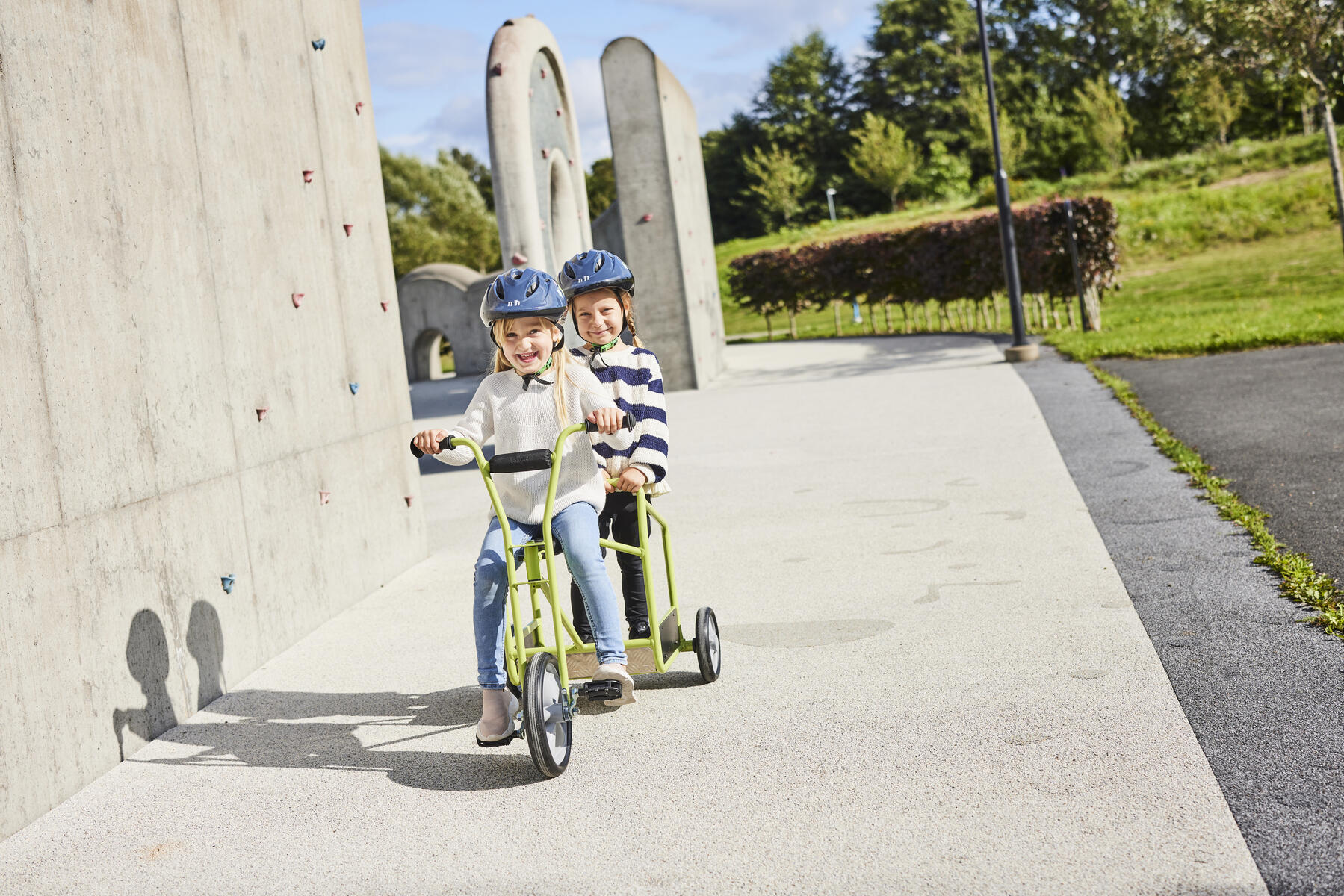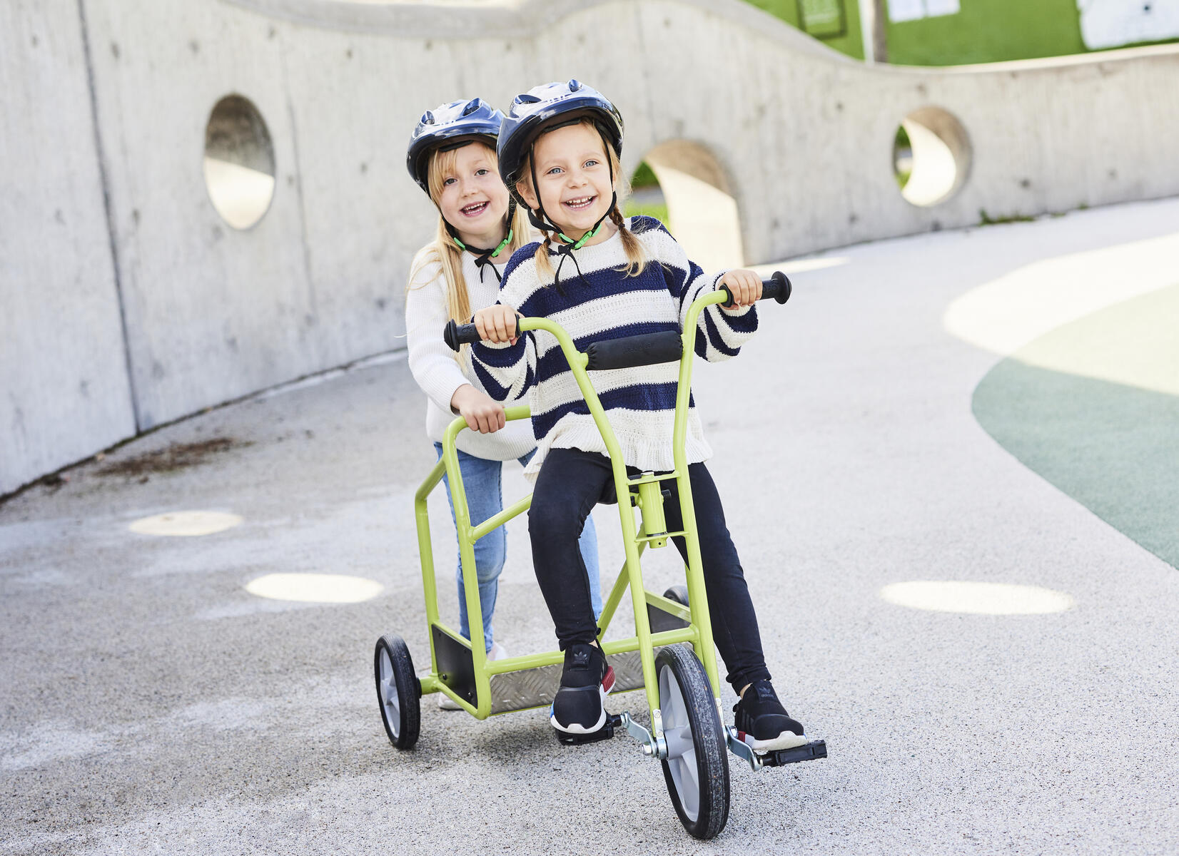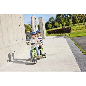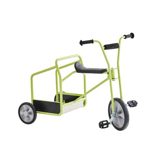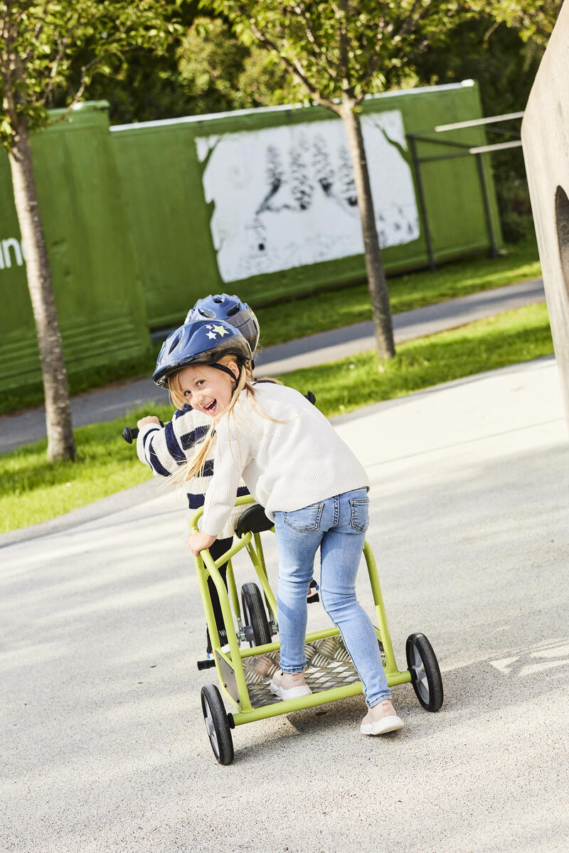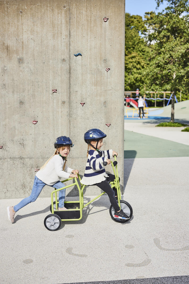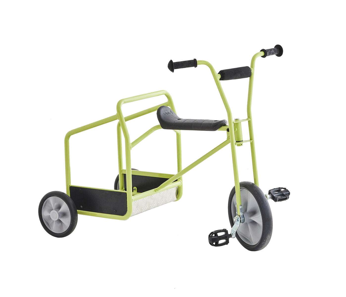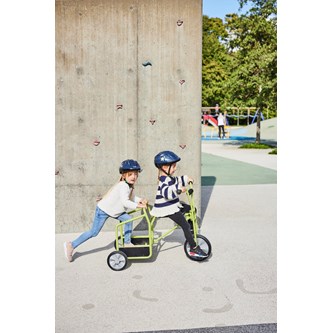 En paket med roliga cyklar med plats för extra passagerare. Utvecklar barnens sociala samspel och samarbetsförmåga. Fotplatta av slitstarkt aluminium, som är lätt att rengöra. Kullagerhjul både fram och bak. Levereras färdigmonterad. Längd: 112 cm. Bredd: 78 cm. Höjd: 71 cm. Sitthöjd: 43 cm. PVC-fri. Från 4 år.