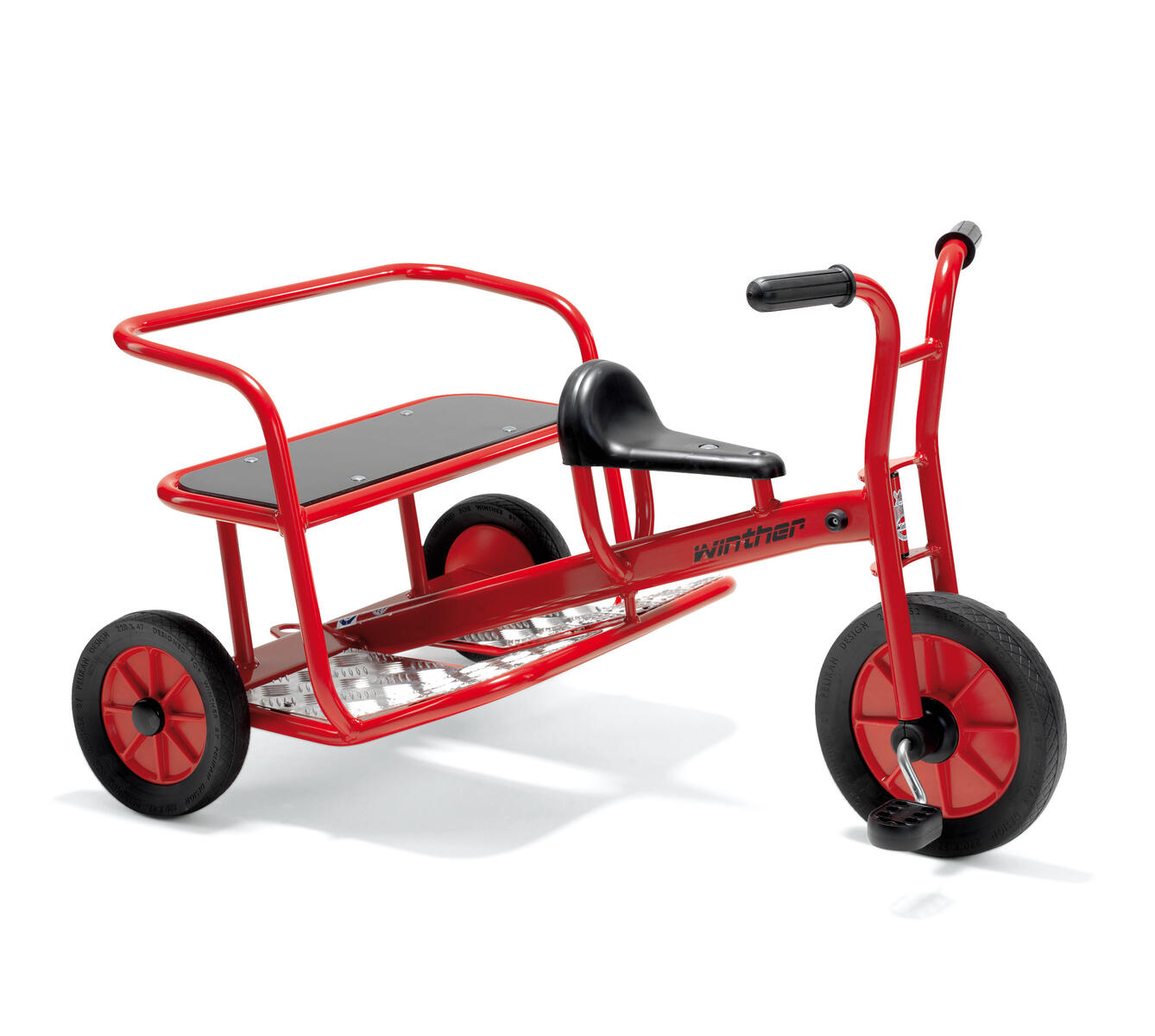 Här kan 2 barn skjutsas samtidigt. Utmärkt för rollekar. Med kullager i både fram- och bakhjulen gör cykeln lättrampad. Enkel montering, anvisning medföljer samt visas på Youtube. Mått: B68xH62 cm. Sitthöjd: 38 cm. Vikt: 20,4 kg. Av stål, PP och TPE. PVC-fri. Ålder 4-8 år.