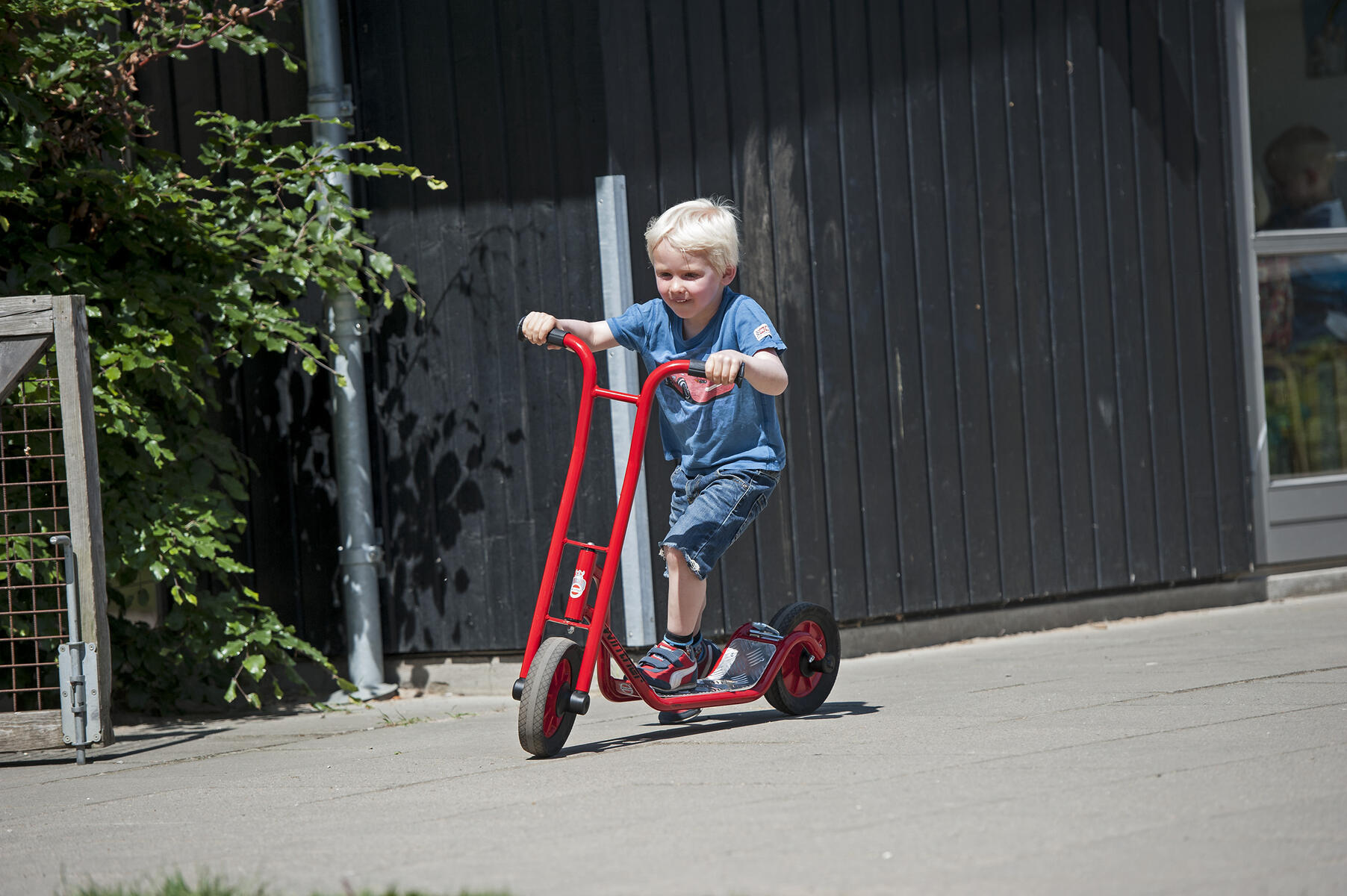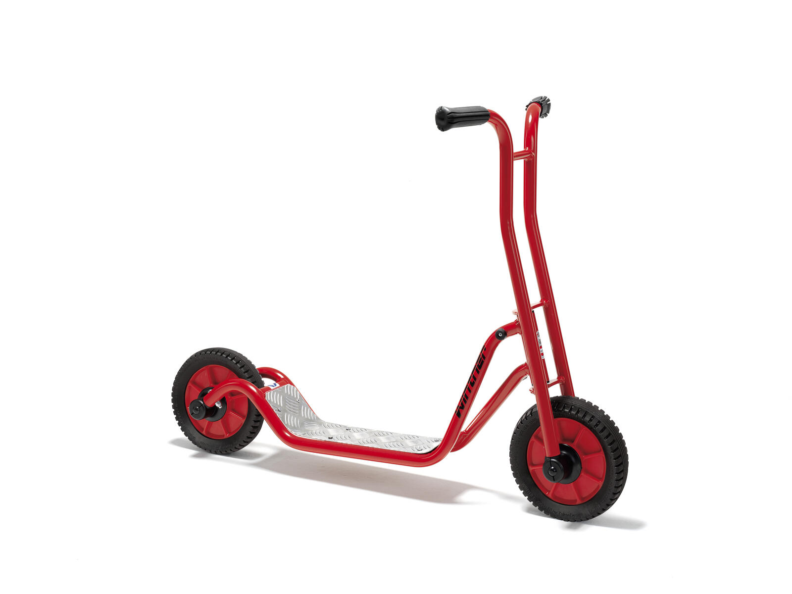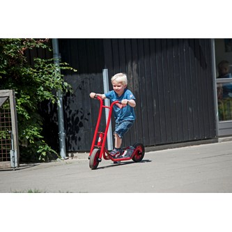 En solid sparkcykel som är speciellt framtagen för fritidshem och skolor. Utvecklar barnens koordination och balans. Med broms på bakhjulet. Fotplatta av slitstarkt aluminium, som är lätt att rengöra. Kullagerhjul. Levereras färdigmonterad. PVC-fri. Ålder 8-12 år.