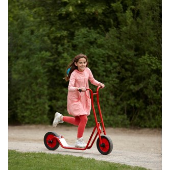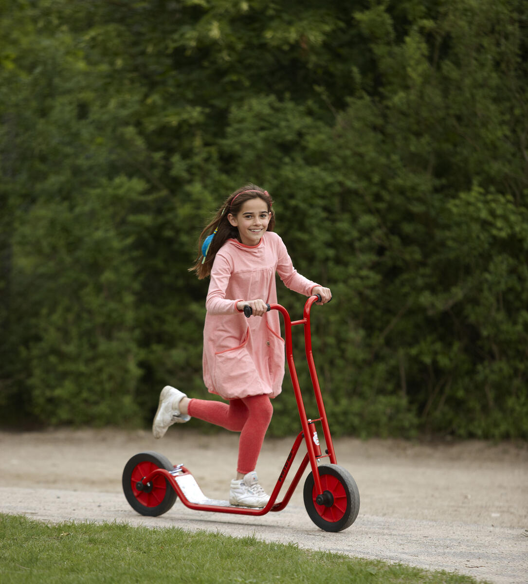 En solid sparkcykel som är speciellt framtagen för fritidshem och skolor. Utvecklar barnens koordination och balans. Med broms på bakhjulet. Fotplatta av slitstarkt aluminium, som är lätt att rengöra. Kullagerhjul. Levereras färdigmonterad. PVC-fri. Ålder 8-12 år.