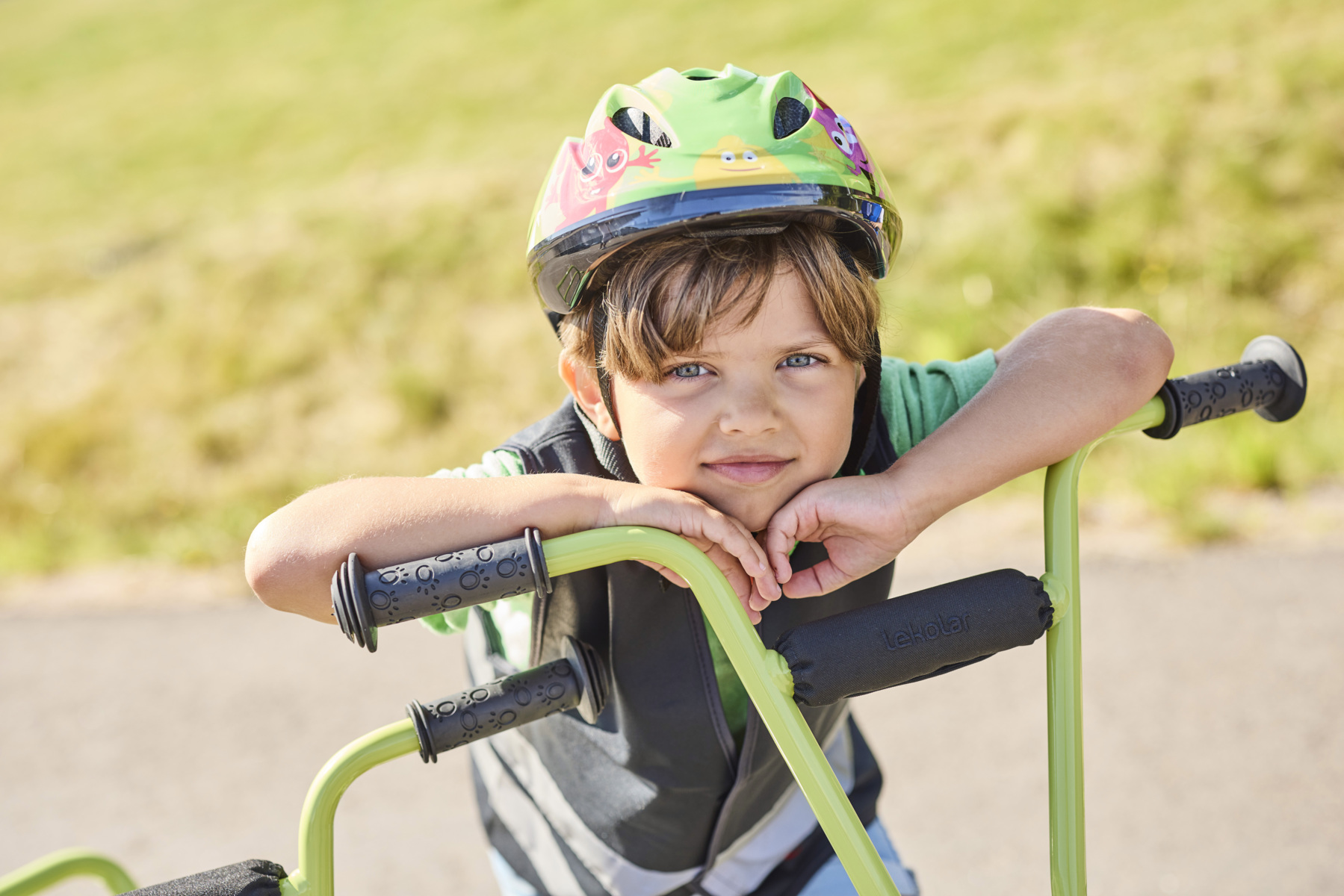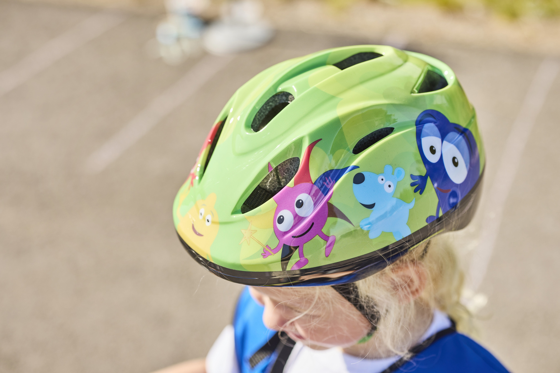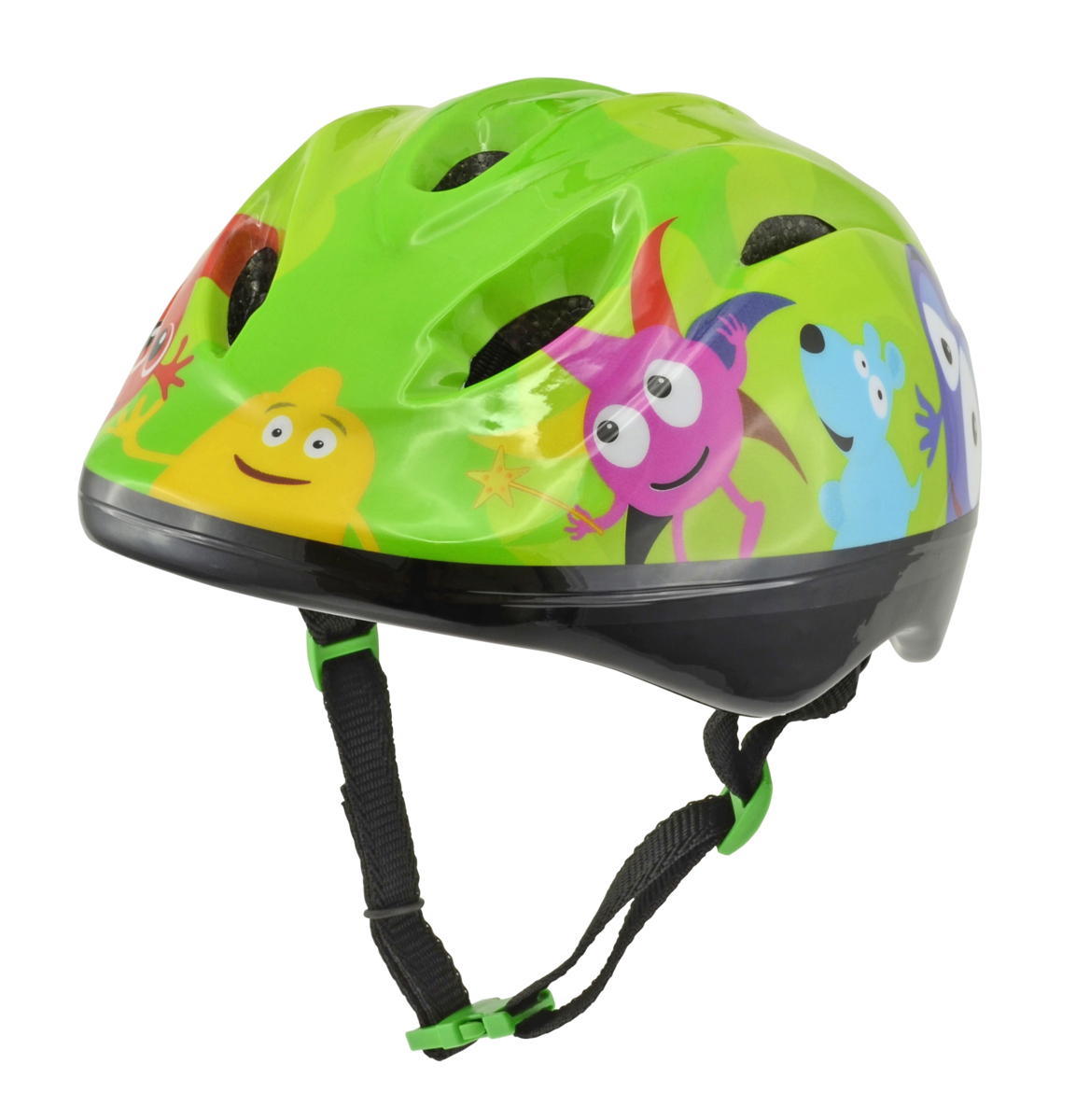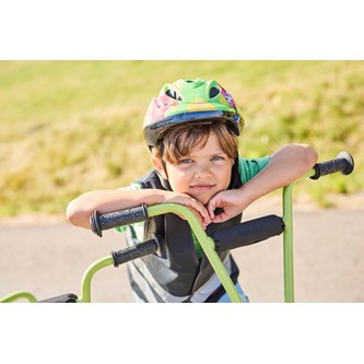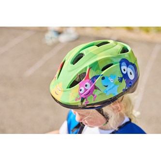 En lätt cykelhjälm som ger utmärkt skydd och komfort vid cykling och andra aktiviteter. Med grönt spänne som löser ut vid viss belastning. Justerbar ring inuti ger optimal passform på huvudet. Godkänd enligt EN 1080:2013 och (EU) 2016/425. Innermått: 49-55 cm. Vikt: 180 g. Av PVC utan förbjudna ftalater. Ålder 2-7 år.
