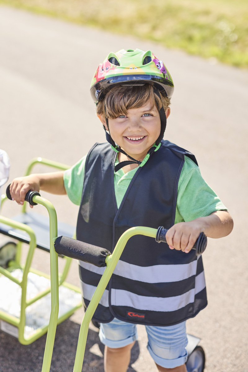 I detta paket ingår hjälm och reflexväst för 6 barn. Hjälmen har grönt spänne som löser ut vid viss belastning och 8 ventilationsöppningar på ovansidan. Justerbar i nacken för bästa möjliga passform. Testad enligt EN 1080. Kombineras med väst som stängs med kardborreband. Ögla för upphängning. Testad och godkänd enligt standard. Av polyester. Tvättas i 40 °C. Från 2 år.