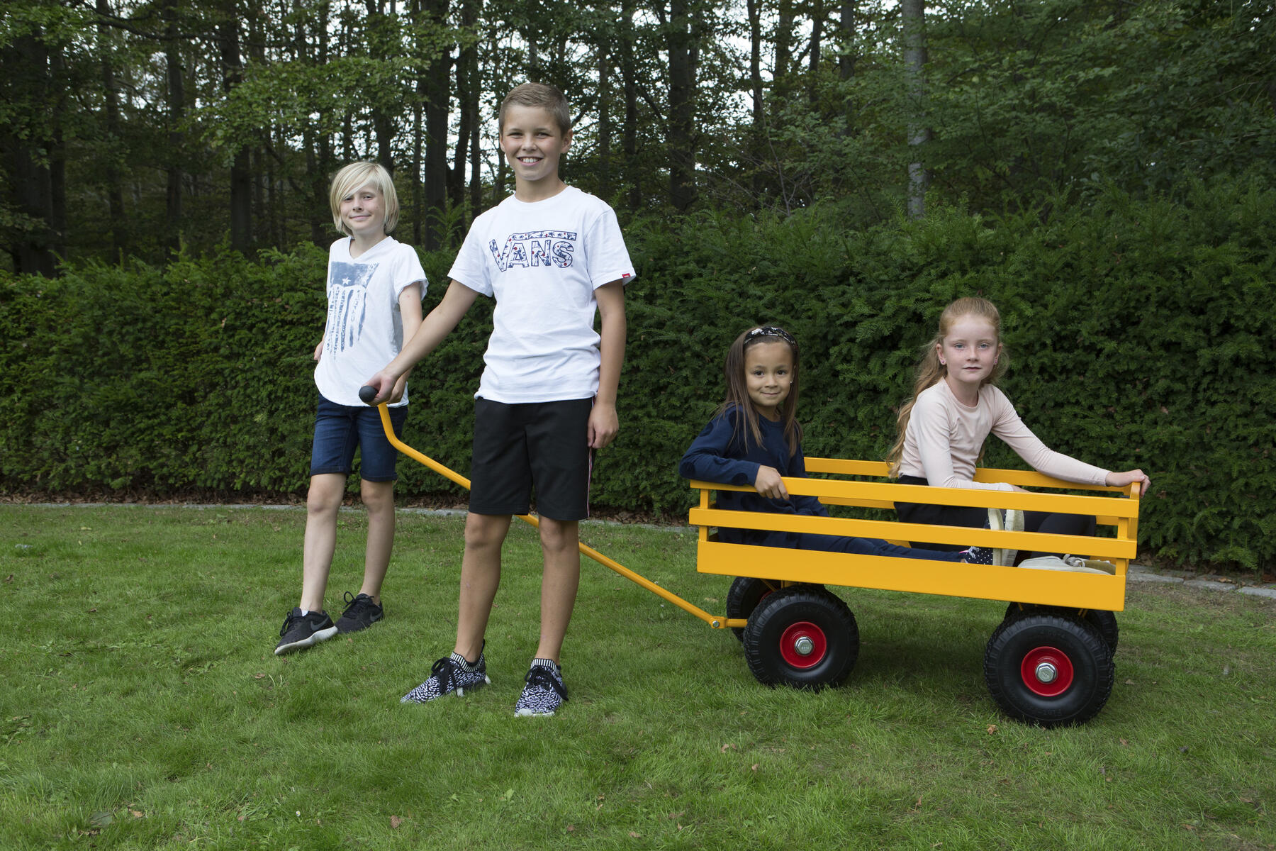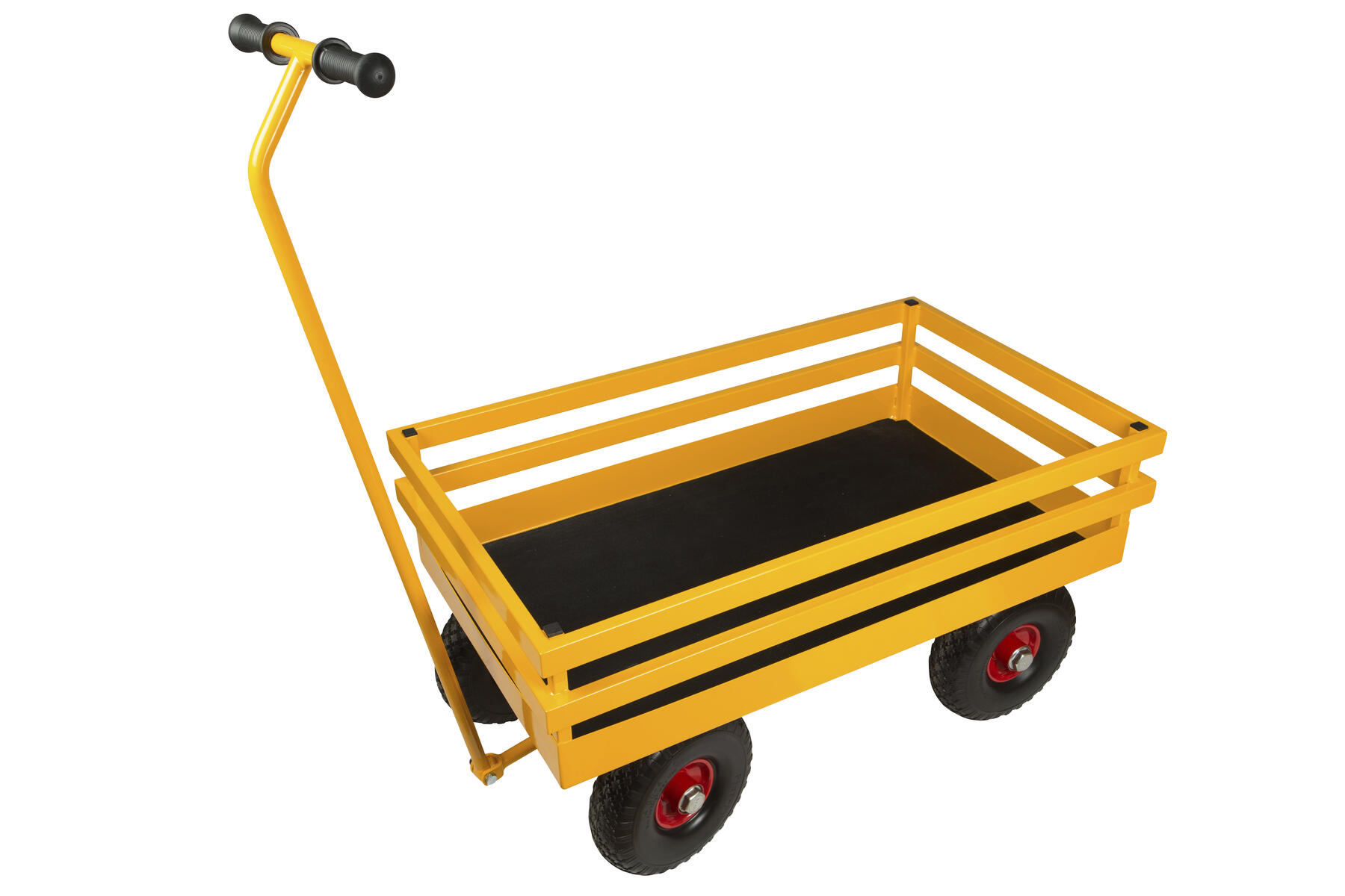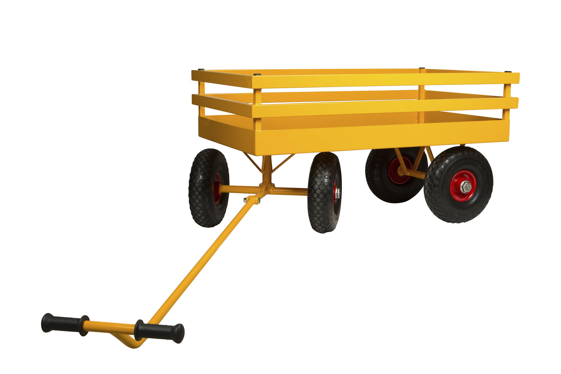En stor och gedigen vagn av vattenavvisande plywood och stålkonstruktion. Skrindan har luftgummihjul med plastfälgar och lager, vilket gör att den rullar väldigt lätt. Vagnens sidor går att plocka bort för att spara plats vid förvaring eller transport. Anvisning medföljer. PVC-fri.