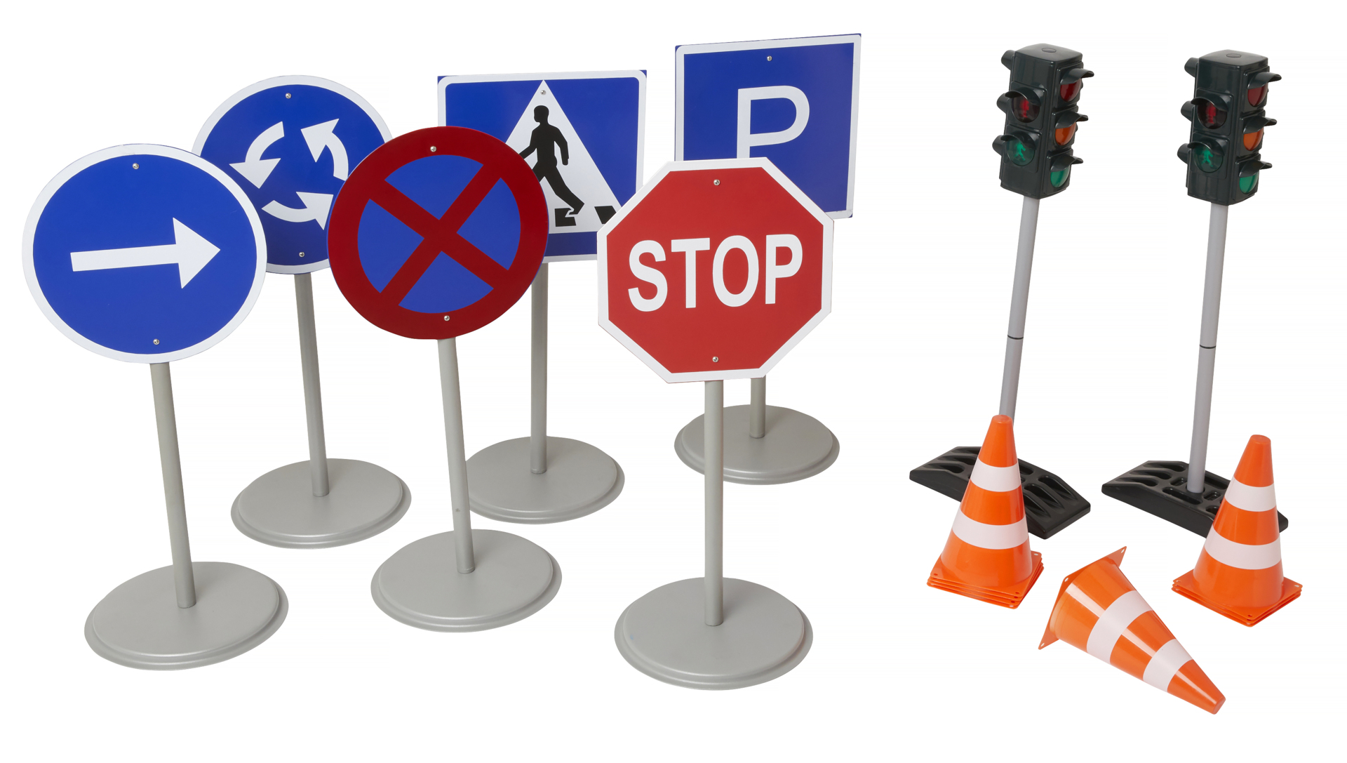 16 delar. Bygg upp en ny lekmiljö på gården och öva trafiksäkerhet. Detta set innehåller trafikskyltar, koner och trafikljus för en både rolig och lärorik lekupplevelse. Trafikljuset drivs med 4 st 1,5 V R6-batterier (ingår ej) och kan fyllas med vatten eller sand för ökad stabilitet. PVC-fri. Från 3 år.