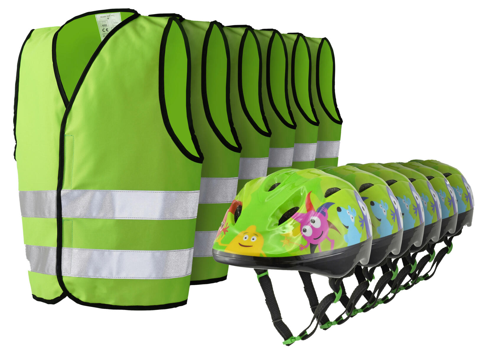 I detta paket ingår hjälm och reflexväst för 6 barn. Hjälmen har grönt spänne som löser ut vid viss belastning och 8 ventilationsöppningar på ovansidan. Justerbar i nacken för bästa möjliga passform. Testad enligt EN 1080. Kombineras med väst som stängs med kardborreband. Ögla för upphängning. Testad och godkänd enligt standard. Av polyester. Tvättas i 40 °C. Från 2 år.