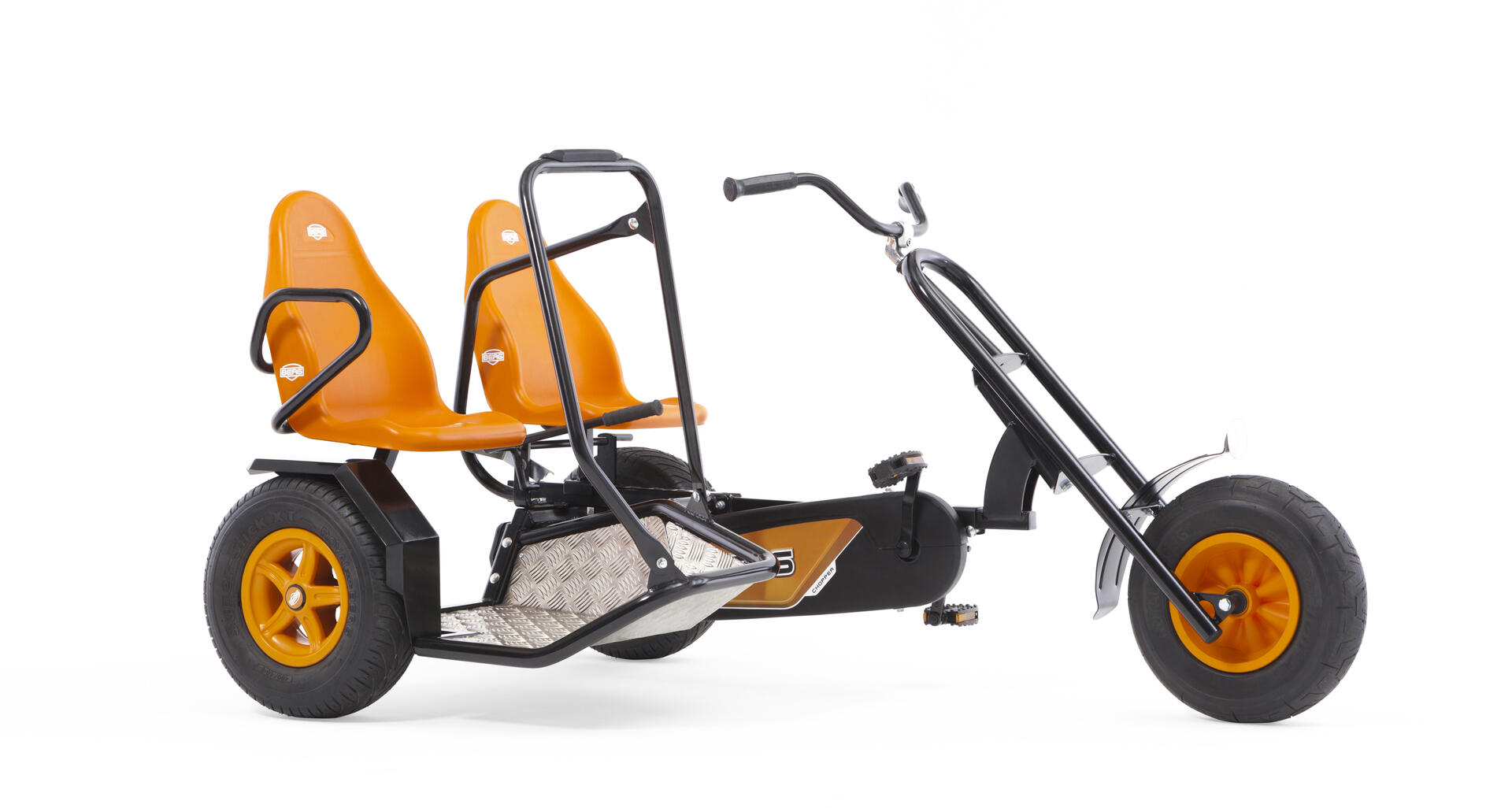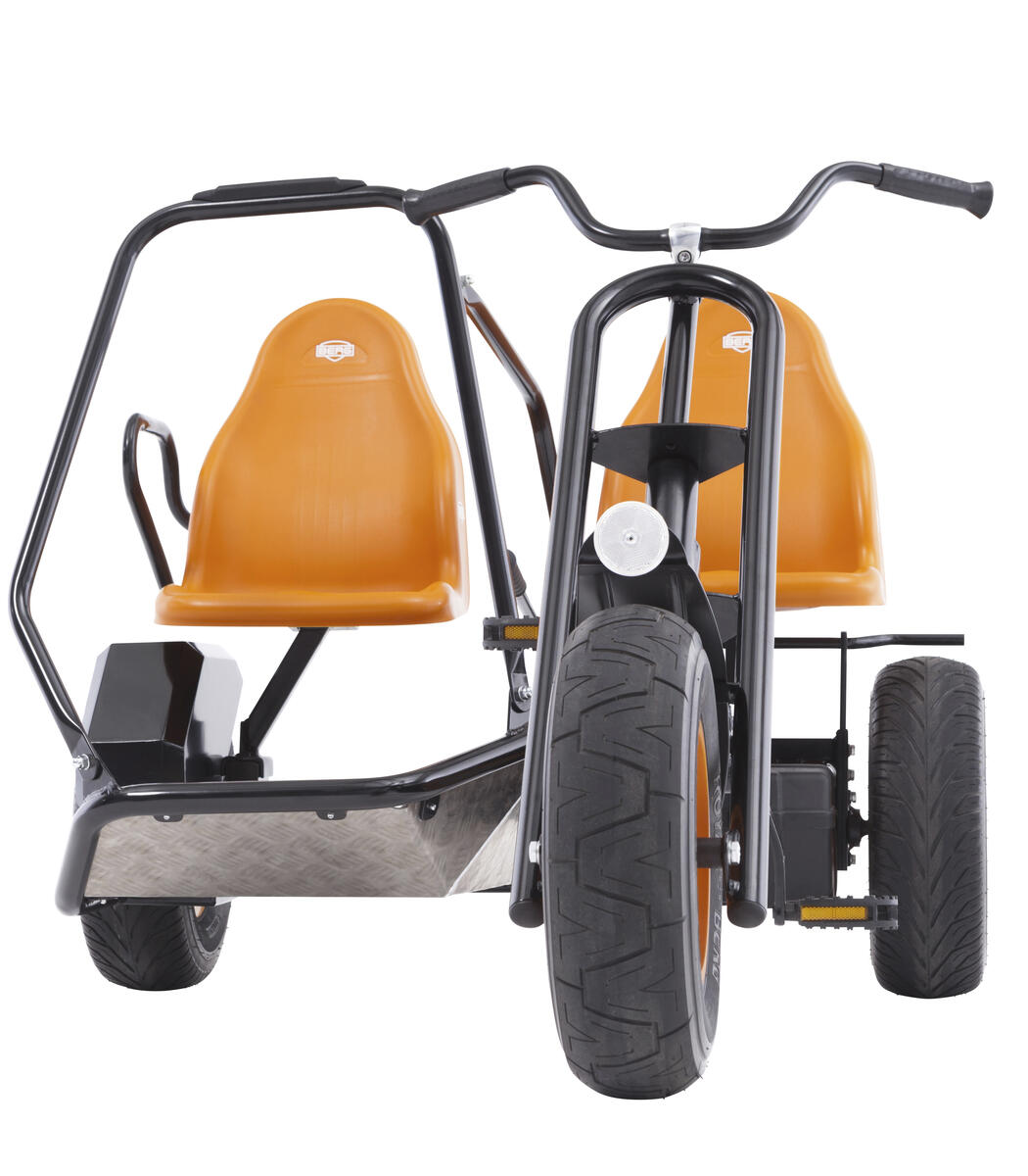 Trampbil med 4 hjul och två säten. Passagerarsätet kan tas bort så att passageraren kan stå på plattformen. BERG Duo Chopper har en robust ram och är lättmanövrerad tack vare liten vändradie. Luftgummidäcken gör den bekväm att köra. Utrustad med frihjulsbroms, handbroms och parkeringsbroms. Ratten och sätet kan justeras i 6 olika lägen. Maxvikt 100 kg per säte. Av stål, gummi och PP.PVC-fri. Ålder 5–12 år.