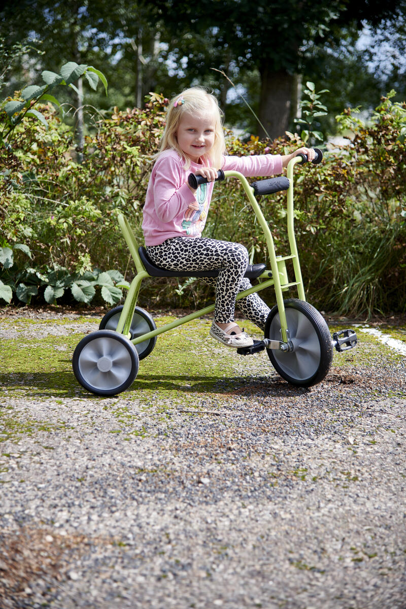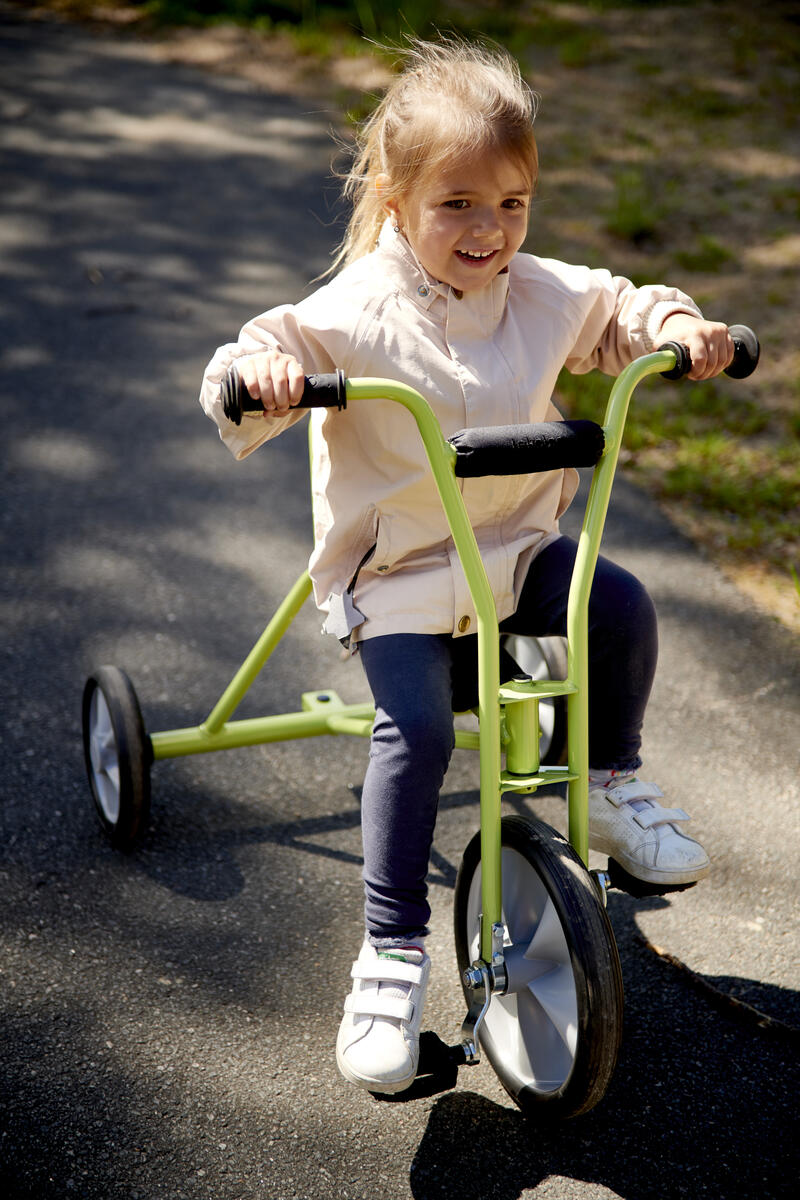 En stark trehjuling i mellanstorlek som är speciellt framtagen för förskolans miljöer. Stimulerar barnens motoriska utveckling. Kullager på både fram- och bakhjul. Mått: L71xB50xH58 cm. Sitthöjd: 33 cm. Levereras färdigmonterad. PVC-fri. Ålder ca 2,5–6 år.