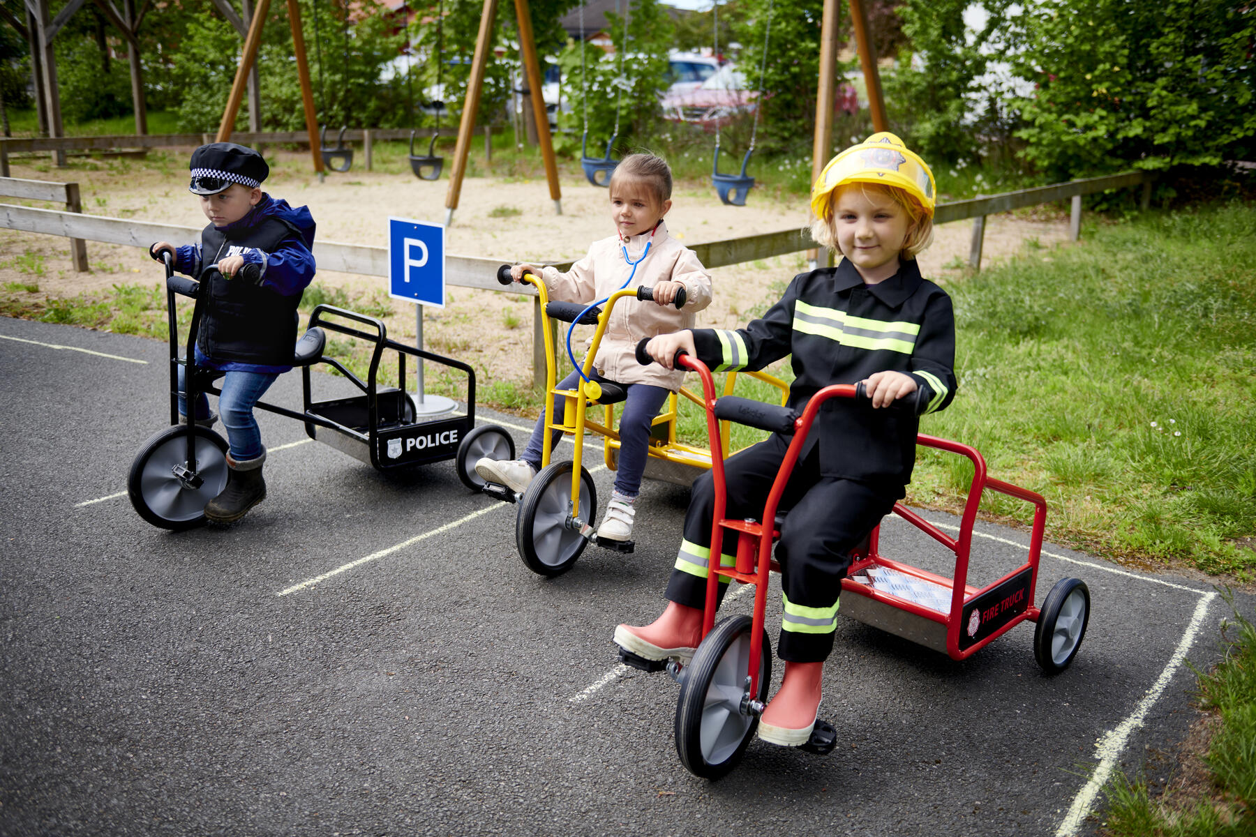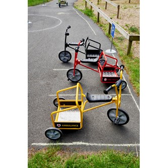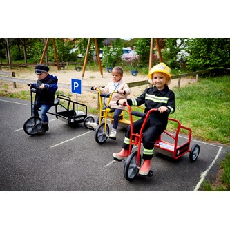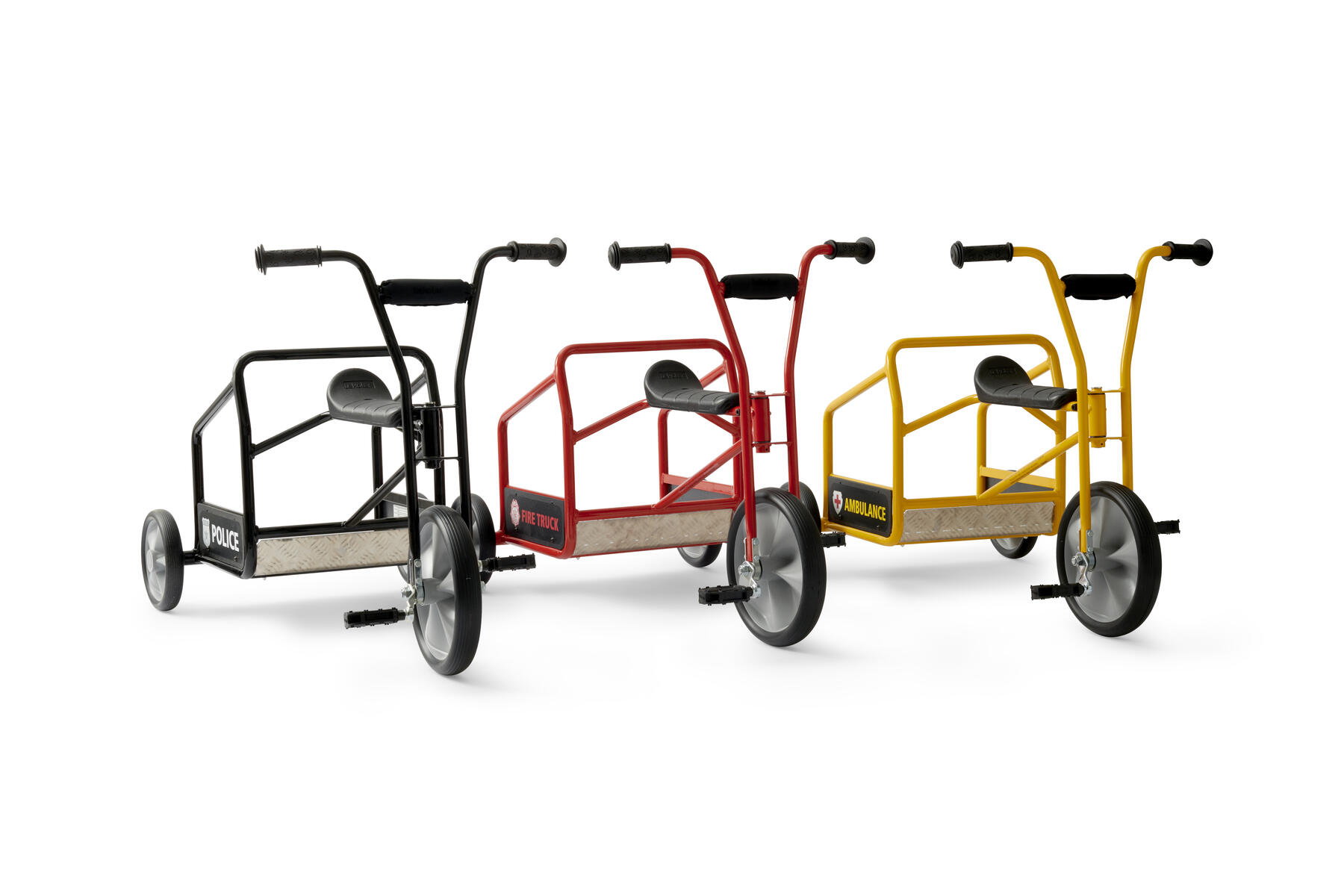 Ett set med alla tre räddningscyklarna för sociala lekar och aktiviteter. Ingår ambulans, brandkår och polis. Här finns plats för en som kör och en som åker. Brett styre med hakkudde fodrad med tjockt skumgummi. Kullager i både fram- och bakhjulen gör cykeln lättrampad. Slitstark aluminiumplatta att stå på för passageraren bak. Mått: L102xB59xH71 cm. Sitthöjd: 43 cm. Levereras färdigmonterad. PVC-fri. Ålder 4-8 år.