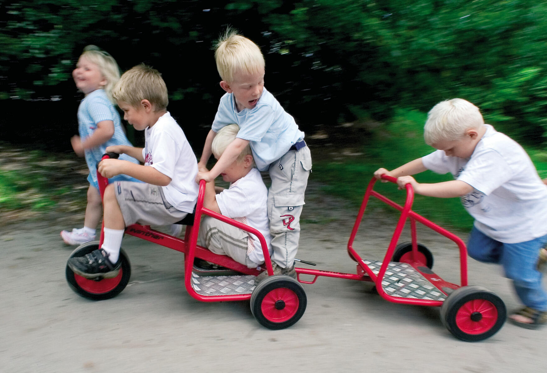 En paket med roliga cyklar med plats för extra passagerare. Utvecklar barnens sociala samspel och samarbetsförmåga. Fotplatta av slitstarkt aluminium, som är lätt att rengöra. Kullagerhjul både fram och bak. Levereras färdigmonterad. Längd: 112 cm. Bredd: 78 cm. Höjd: 71 cm. Sitthöjd: 43 cm. PVC-fri. Från 4 år.