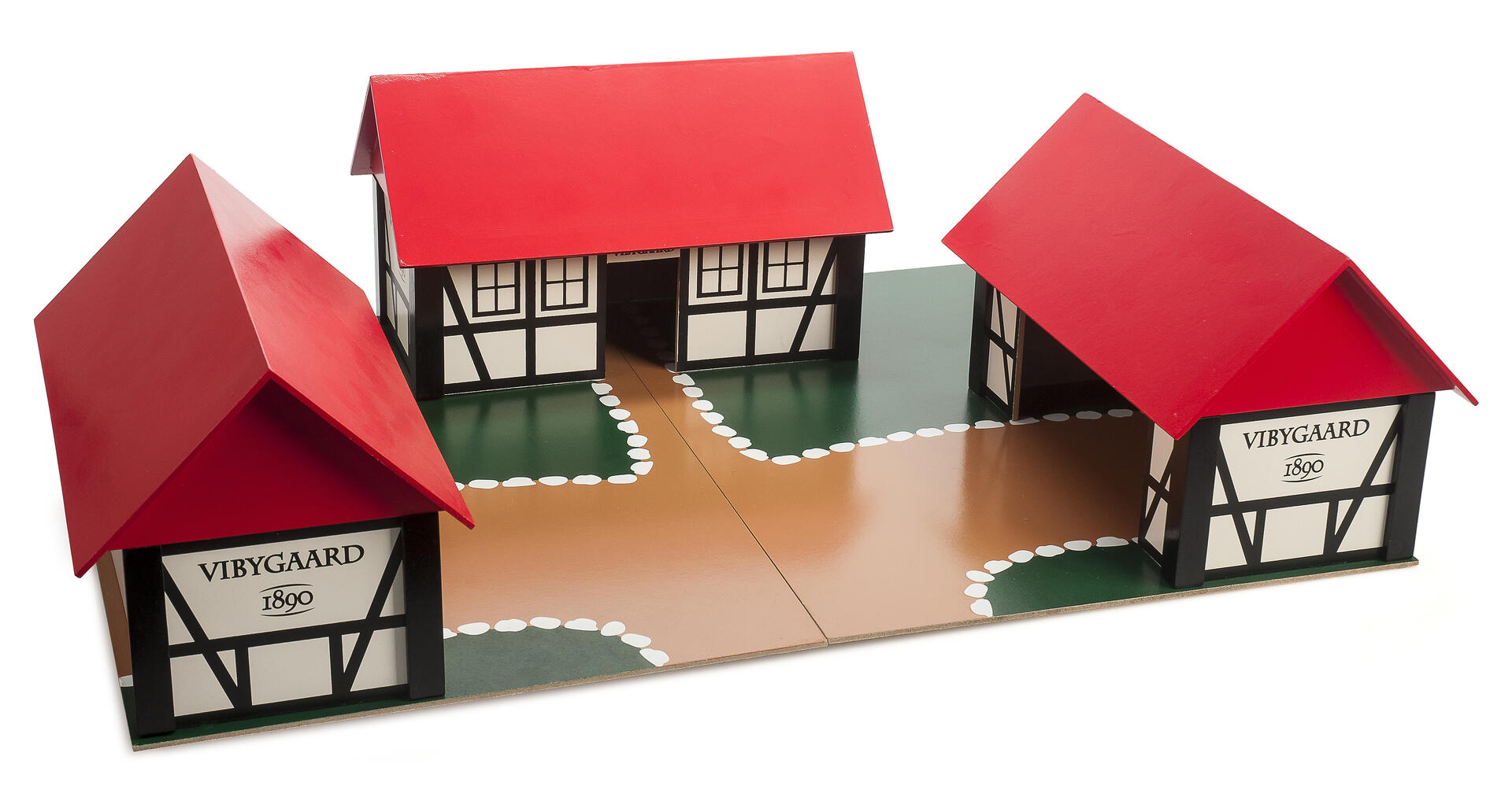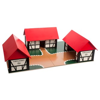 En klassisk bondgård med 2 tillhörande stall. Flyttbara längor med avtagbara tak. Av MDF. PVC-fri. Djur och traktorer ingår ej. Mått: 60x44x16 cm. Varje hus mäter 11,8 x 23,7 x 9,8 cm utan tak. Från 3 år.