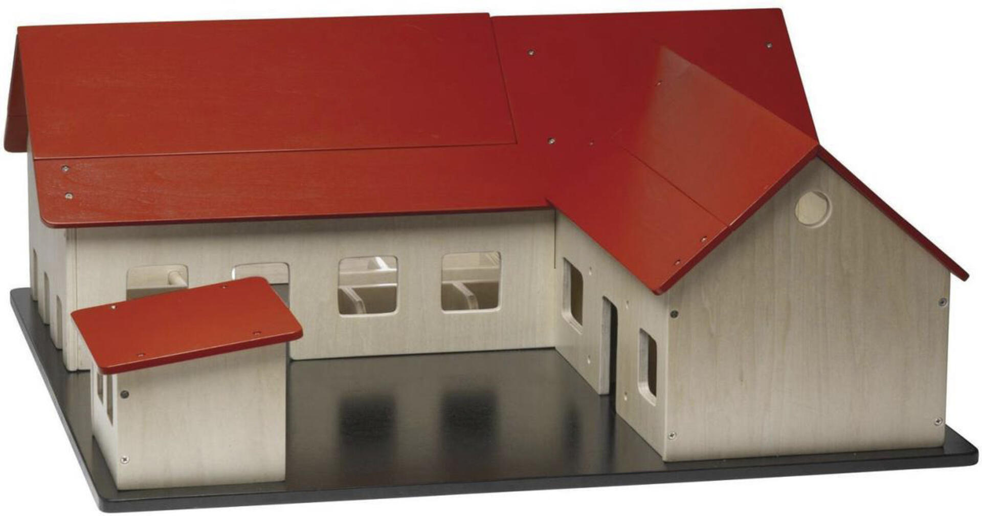 En klassisk bondgård med 2 tillhörande stall. Flyttbara längor med avtagbara tak. Av MDF. PVC-fri. Djur och traktorer ingår ej. Mått: 60x44x16 cm. Varje hus mäter 11,8 x 23,7 x 9,8 cm utan tak. Från 3 år.