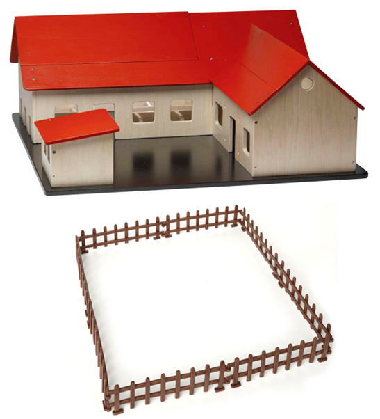 En bondgård med 19 stycken tillhörande bondgårdsdjur. Bondgården har avtagbart tak. Höjd 25 cm. Bredd 60 cm. Längd 60 cm. Av plywood. Djuren är handmålade och detaljrika. Mått; 4-15 cm. Av TPE. Staket i plast. Längd per del: 22 cm. Från 3 år.