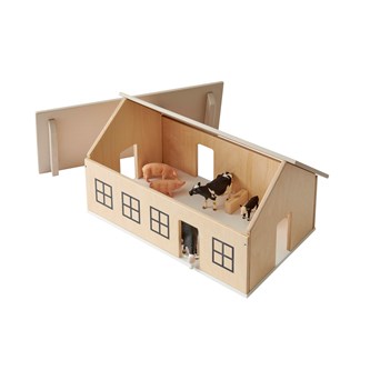 En stor och rejäl bondgård med uthus och gårdsplan. Bondgården har många fönster, bås till djuren, staket och avtagbart tak som möjliggör lek från flera håll och för många barn samtidigt. Levereras färdigmonterat. Djur ingår ej. Av tjock, lackerad FSC-godkänd plywood. PVC-fri. Mått: 74x54x29 cm. Från 2 år. Svanenmärkt, licensnummer 5095 0005.
