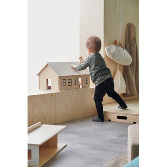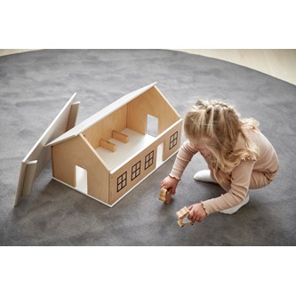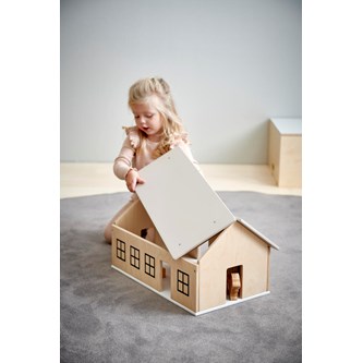 En bondgård i traditionell design med utskurna dörröppningar och tryckta fönster. Med boxar till djuren och avtagbart tak. Levereras färdigmonterad. Av tjock, lackerad FSC-godkänd plywood. PVC-fri. Från 2 år. Svanenmärkt, licensnummer 5095 0005.