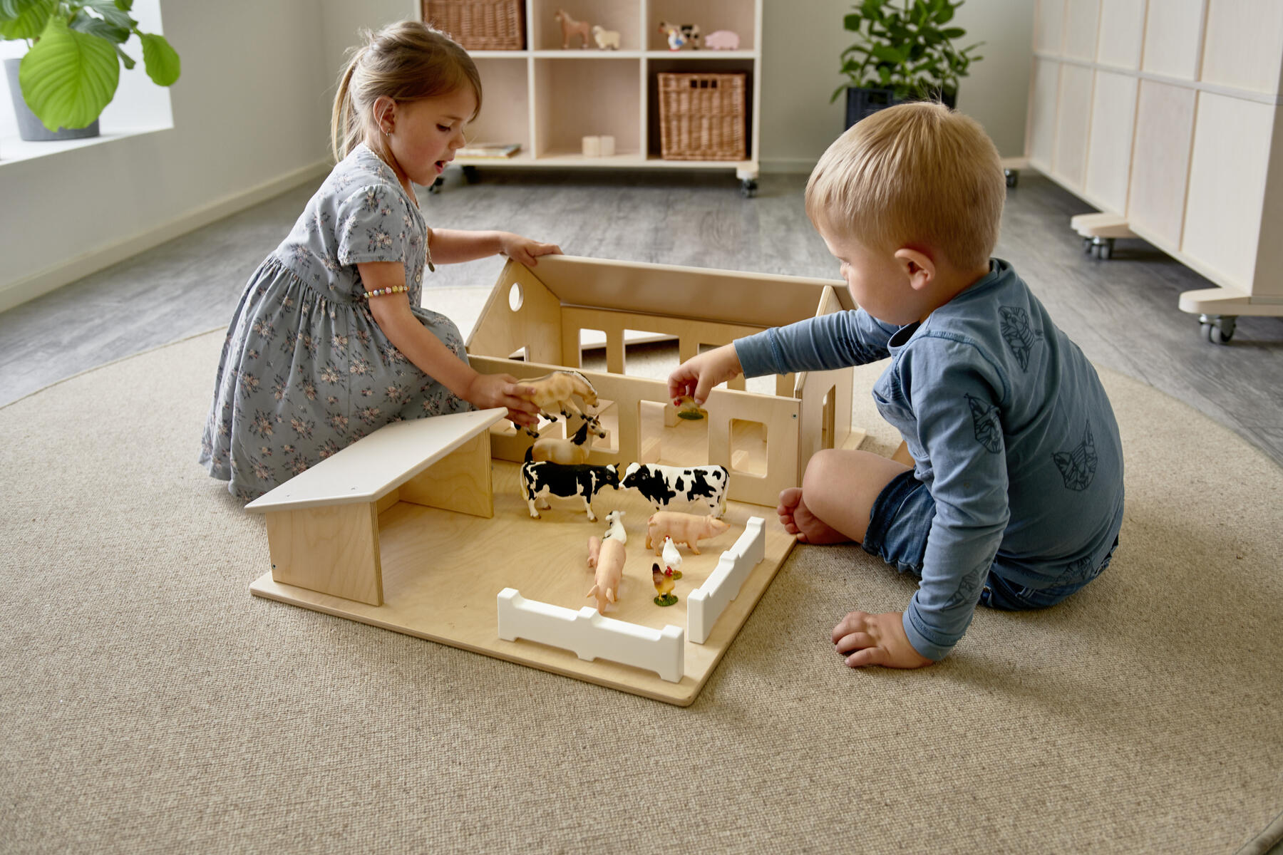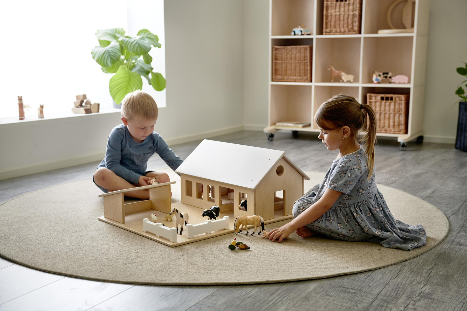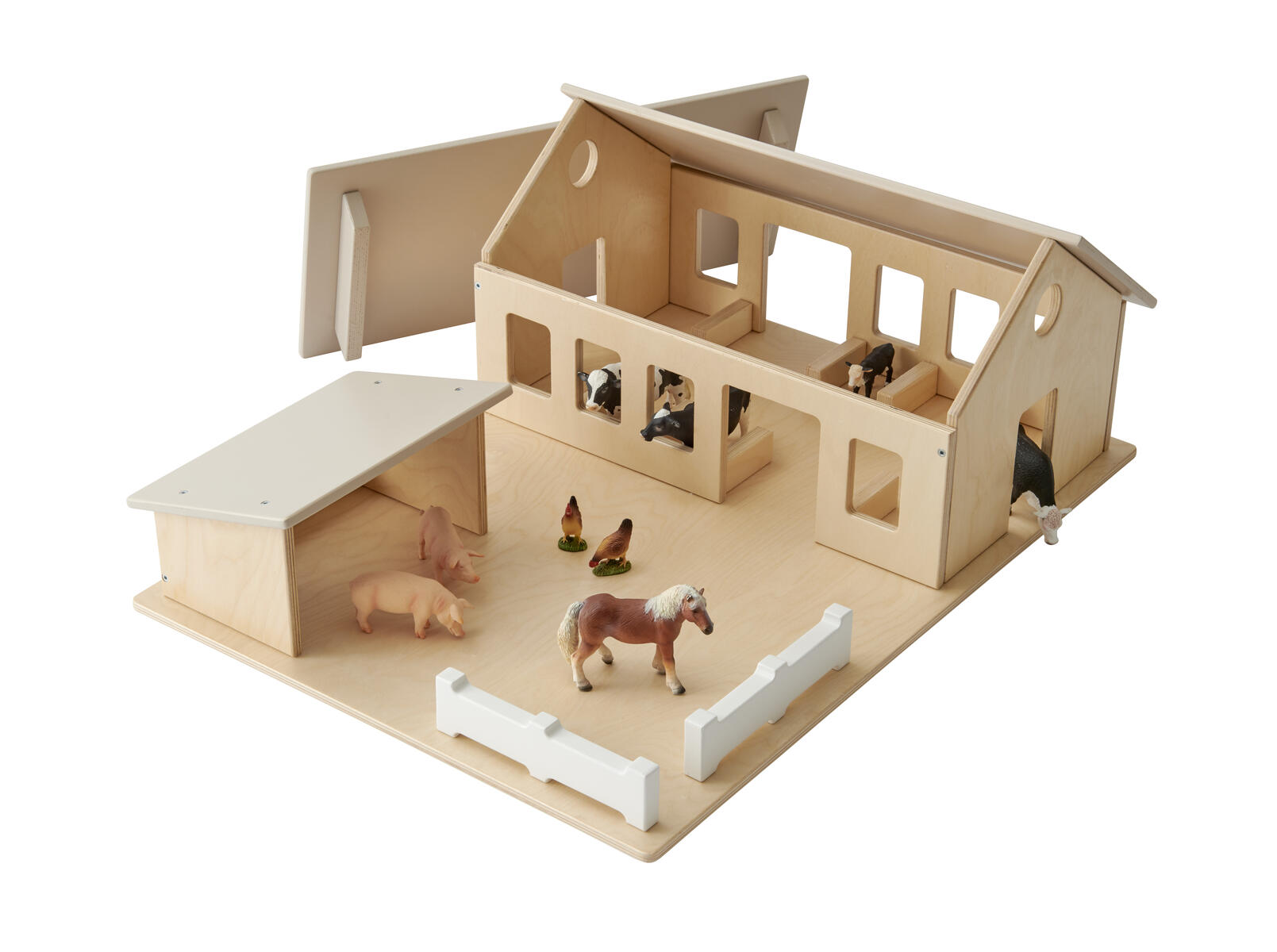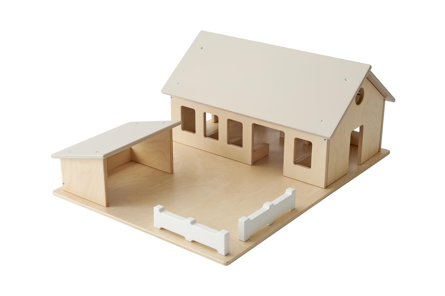 En bondgård i traditionell design med utskurna dörröppningar och tryckta fönster. Med boxar till djuren och avtagbart tak. Levereras färdigmonterad. Av tjock, lackerad FSC-godkänd plywood. PVC-fri. Från 2 år. Svanenmärkt, licensnummer 5095 0005.