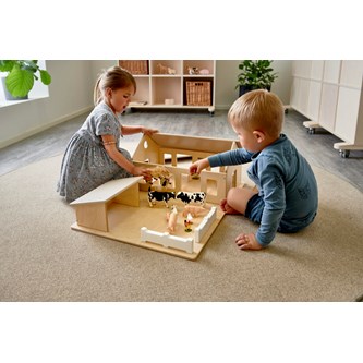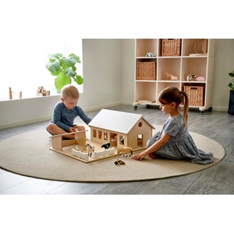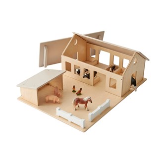 En stor och rejäl bondgård med uthus och gårdsplan. Bondgården har många fönster, bås till djuren, staket och avtagbart tak som möjliggör lek från flera håll och för många barn samtidigt. Levereras färdigmonterat. Djur ingår ej. Av tjock, lackerad FSC-godkänd plywood. PVC-fri. Mått: 74x54x29 cm. Från 2 år. Svanenmärkt, licensnummer 5095 0005.