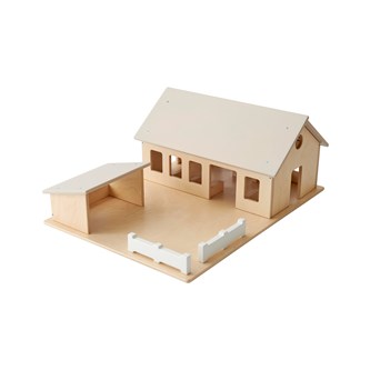 En klassisk bondgård med 2 tillhörande stall. Flyttbara längor med avtagbara tak. Av MDF. PVC-fri. Djur och traktorer ingår ej. Mått: 60x44x16 cm. Varje hus mäter 11,8 x 23,7 x 9,8 cm utan tak. Från 3 år.