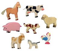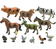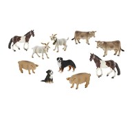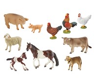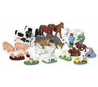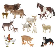 Ett stort set med bondgårdsdjur som är handmålade och av mycket fin kvalitet. Innehållet kan variera, men antalet figurer är samma. Ett av de minsta djuren, en kanin, mäter 4,5x2,5 cm, ett av de största, en hingst, mäter 16,3x10,9cm. Av ftalatfri PVC. Från 3 år.