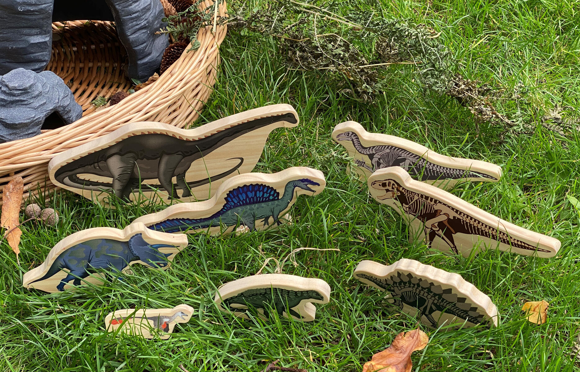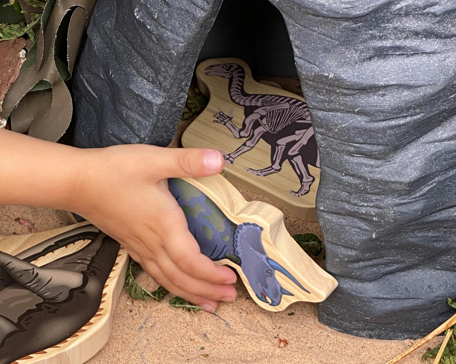 8 st/fp. Detaljrika dinosaurier av trä. På ena sidan syns dinosauriens yttre och på andra skelettet. Innehåller Ankylosaurus, Diplodocus, Iguanodon, Spinosaurus, Stegosaurus, Triceratops, Tyrannosaurus rex och Velociraptor. Mått: ca B7,7xL2,6 cm. Av FSC-märkt trä. PVC-fri. Från 18 månader.