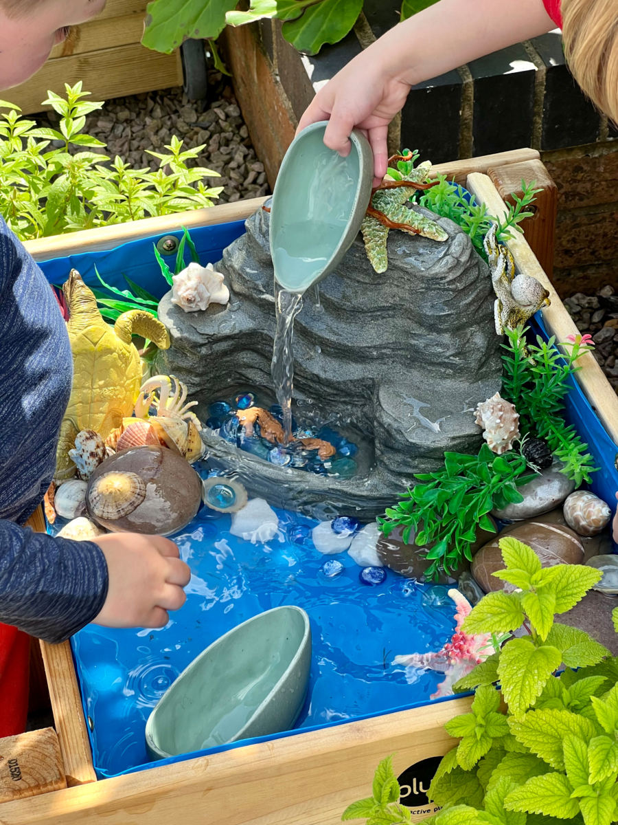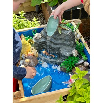 Stort vattenfall i sten som barnen kan hälla vatten nerför och som inspirerar till fantasifull lek. Tillverkat av en unik sten- och hartsblandning och kan användas utomhus i vatten, sand och lera. Mått: 29 cm bred. PVC-fri. Från 3 år.