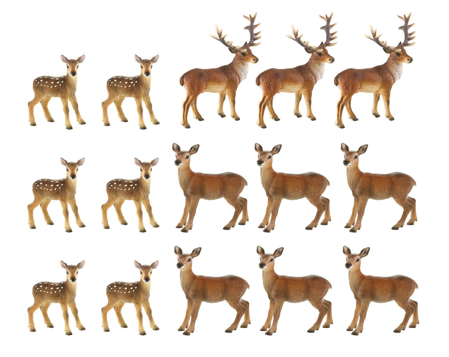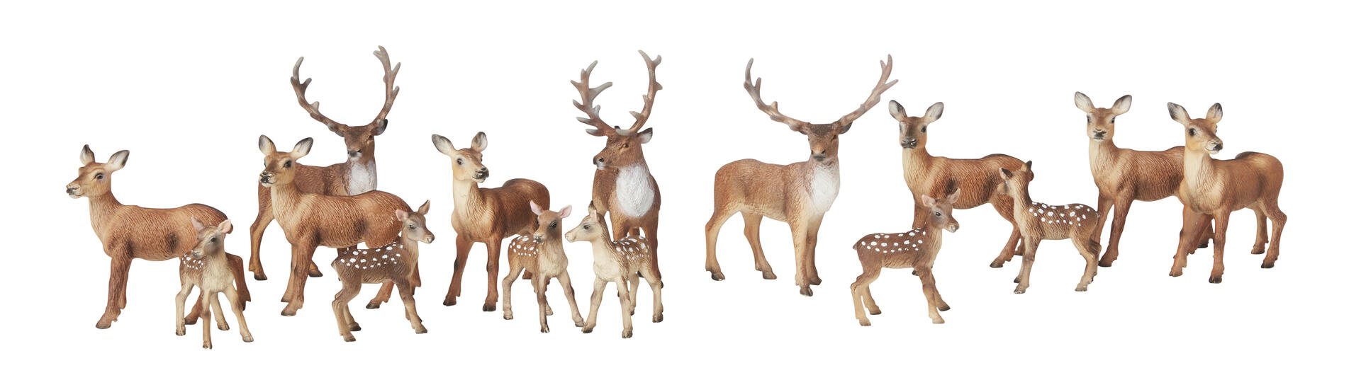 15 st/fp. Kronhjort med hane, hind och kalv. Hanen är ca 12,5 cm hög. Av TPE. PVC-fri. Från 3 år.