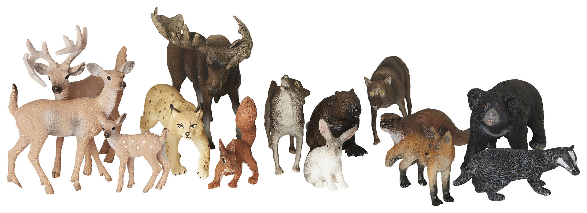 En förpackning med fina och detaljrika skogsdjur. Innehåller: Svartbjörn, grävling, kanin, älg, lodjur, ekorre, varg, bäver, vildsvin, räv, hjortar, och järv.