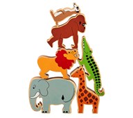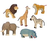Mycket fina och rejäla vilda djur av trä. Djurens design och stabila form gör dem lätta att leka med. De är ca 2,5 cm tjocka, mjuka och behagliga att ta i. Figurerna är målade med giftfri, vattenbaserad färg. Innehåller tiger, lejon, giraff, elefant, zebra och flodhäst. PVC-fri. Från 3 år.