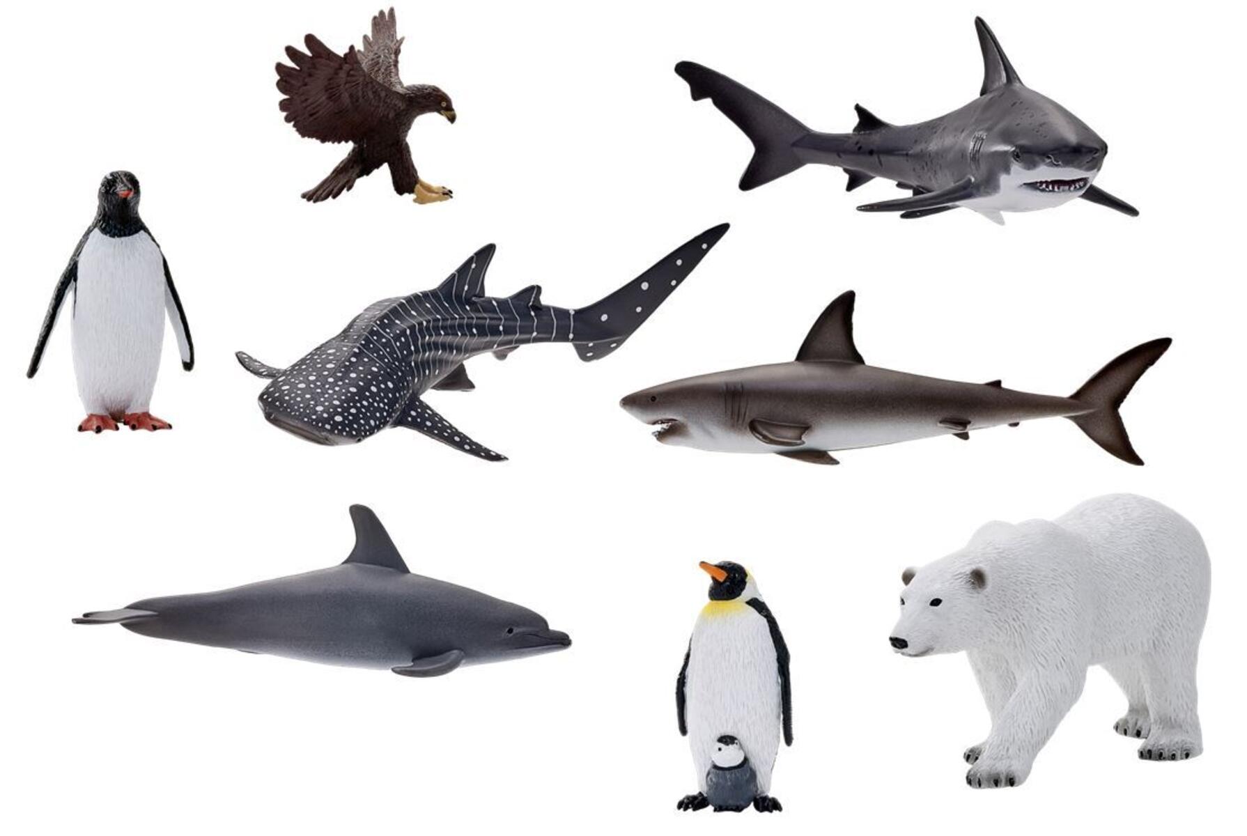 13 st/fp. Havets djur i enklare utförande. Fascinerande och detaljrika djur som lever i havet. Innehåller knölval, gråval, späckhuggare, vithaj, kaskelot, isbjörn, pingvin, valhaj, vithaj, tjurhaj, delfin, kungsörn och kejsarpingvin med unge. Längd 22–30 cm. Mått 6,5-16 cm. Av TPR, PVC, fri från ftalater. Från 3 år.