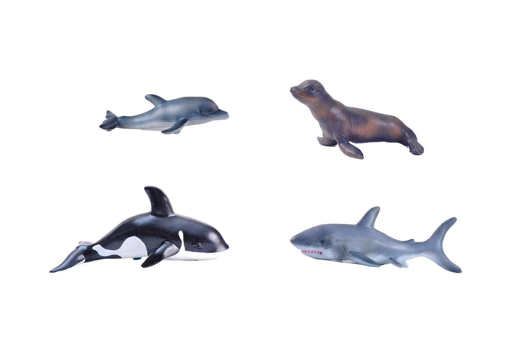 13 st/fp. Havets djur i enklare utförande. Fascinerande och detaljrika djur som lever i havet. Innehåller knölval, gråval, späckhuggare, vithaj, kaskelot, isbjörn, pingvin, valhaj, vithaj, tjurhaj, delfin, kungsörn och kejsarpingvin med unge. Längd 22–30 cm. Mått 6,5-16 cm. Av TPR, PVC, fri från ftalater. Från 3 år.