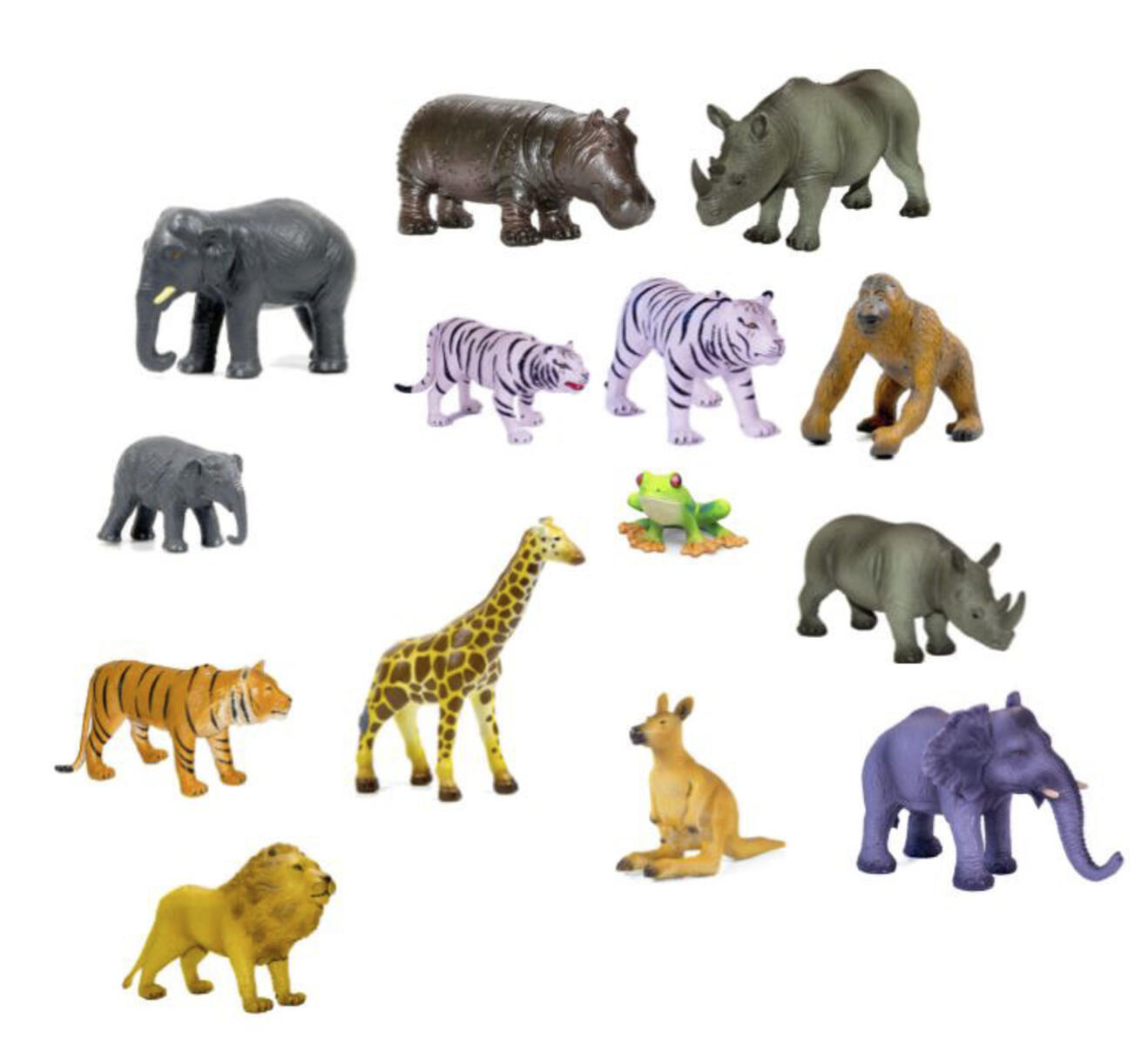 Vilda djur i enklare utförande av TPU. Innehåller elefanter, giraff, flodhäst, apa, kamel, zebra, känguru, lejon, struts, björn, isbjörn och pingvin. Från 3 år.
