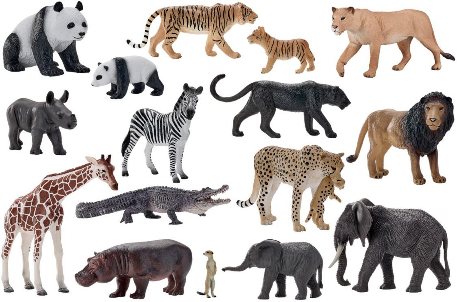 Fina och detaljrika djur från olika delar av världen. Innehåller: tiger, elefant, zebra, giraff, lejonhona, lejonhane, vit tiger och känguru med varsin baby. Av ftalatfri PVC. Från 3 år.