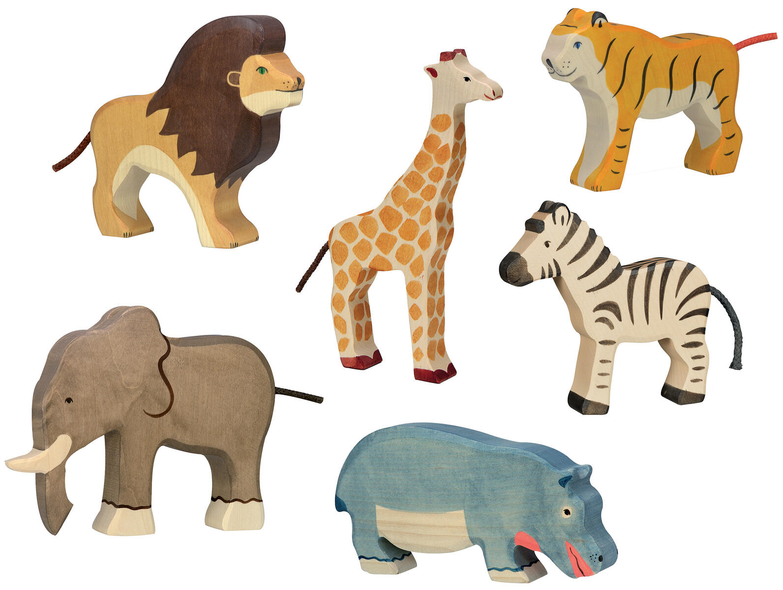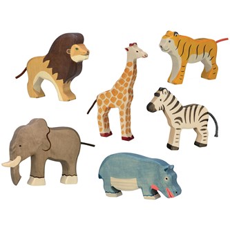 Mycket fina och rejäla vilda djur av trä. Djurens design och stabila form gör dem lätta att leka med. De är ca 2,5 cm tjocka, mjuka och behagliga att ta i. Figurerna är målade med giftfri, vattenbaserad färg. Innehåller tiger, lejon, giraff, elefant, zebra och flodhäst. PVC-fri. Från 3 år.