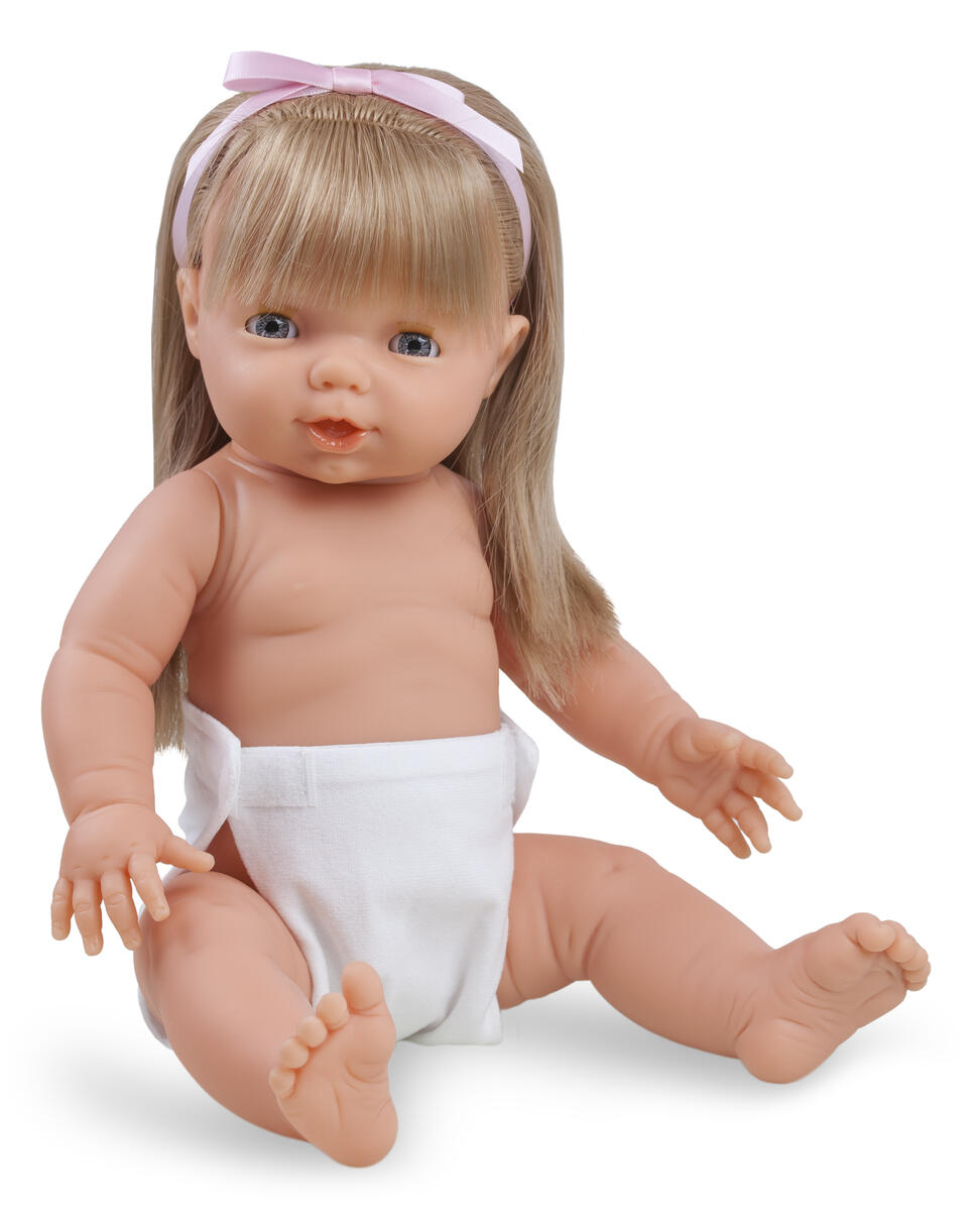 Docka med mjukstoppad kropp och blundögon. Längd 40 cm. Dockans armar, huvud och ben är tillverkade av PVC, utan förbjudna ftalater. Handtvätt. Från 2 år.