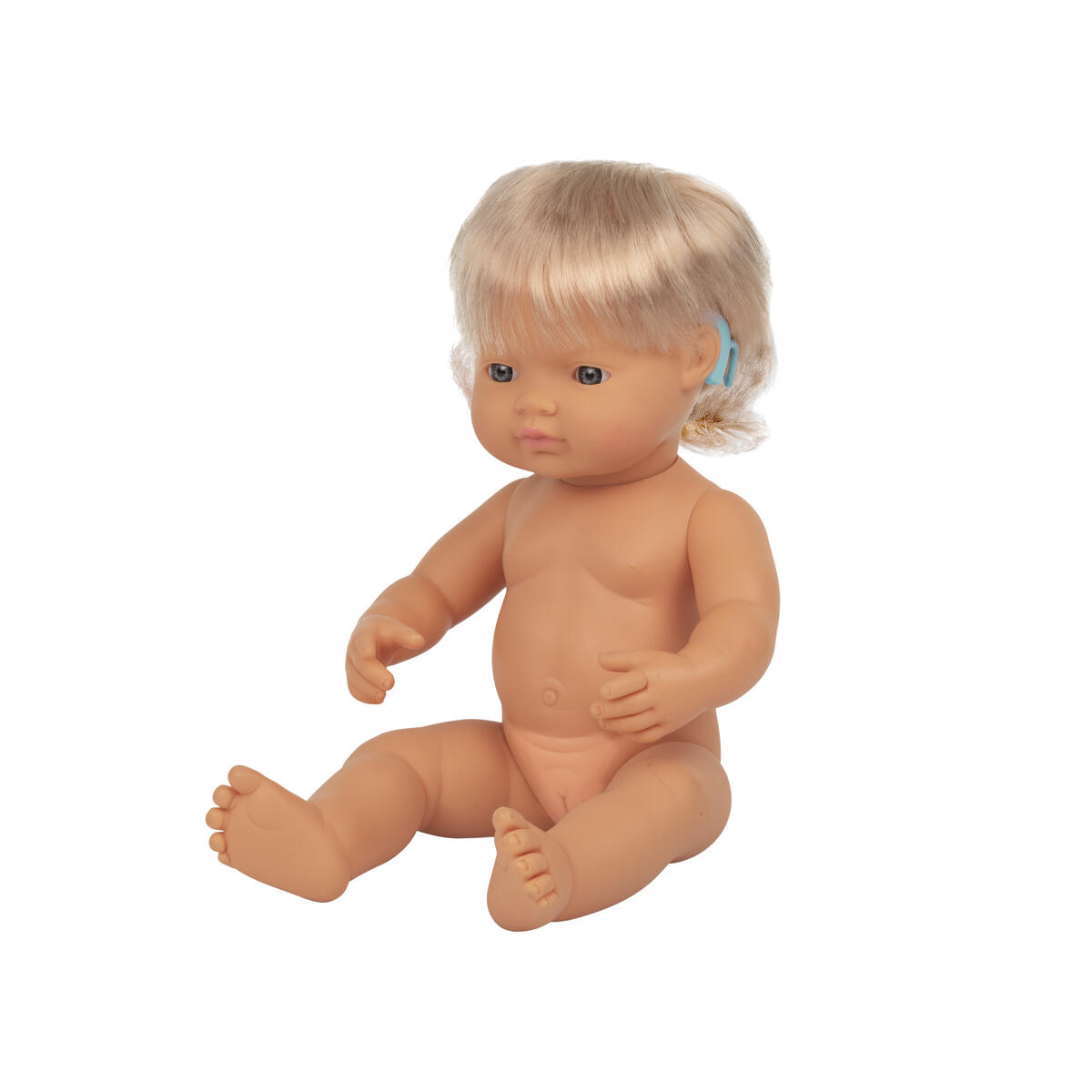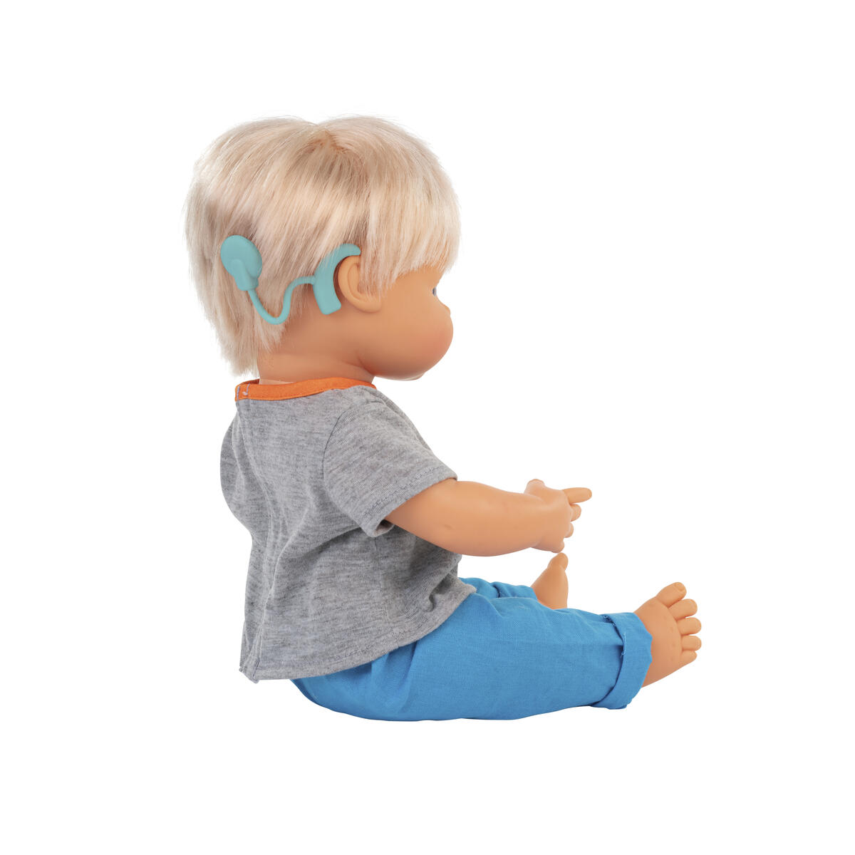 Docka med hörselnedsättning. Rörliga armar och ben. Längd 38 cm. Av PVC, utan förbjudna ftalater. Från 3 år.