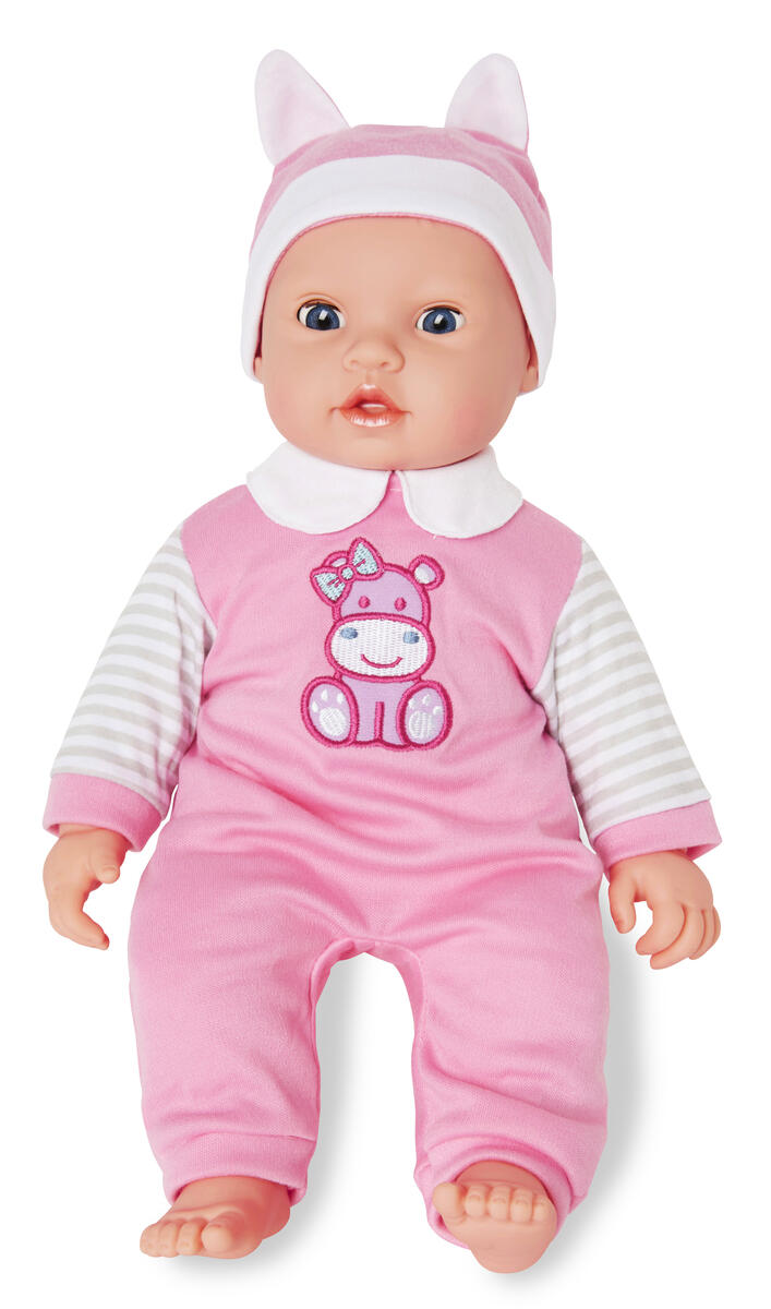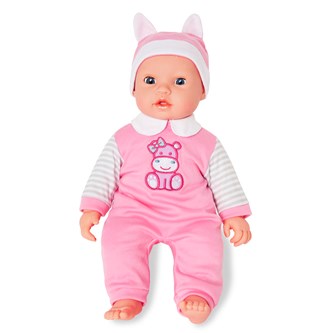 Docka med mjukstoppad kropp och blundögon. Längd 40 cm. Dockans armar, huvud och ben är tillverkade av PVC, utan förbjudna ftalater. Handtvätt. Från 2 år.