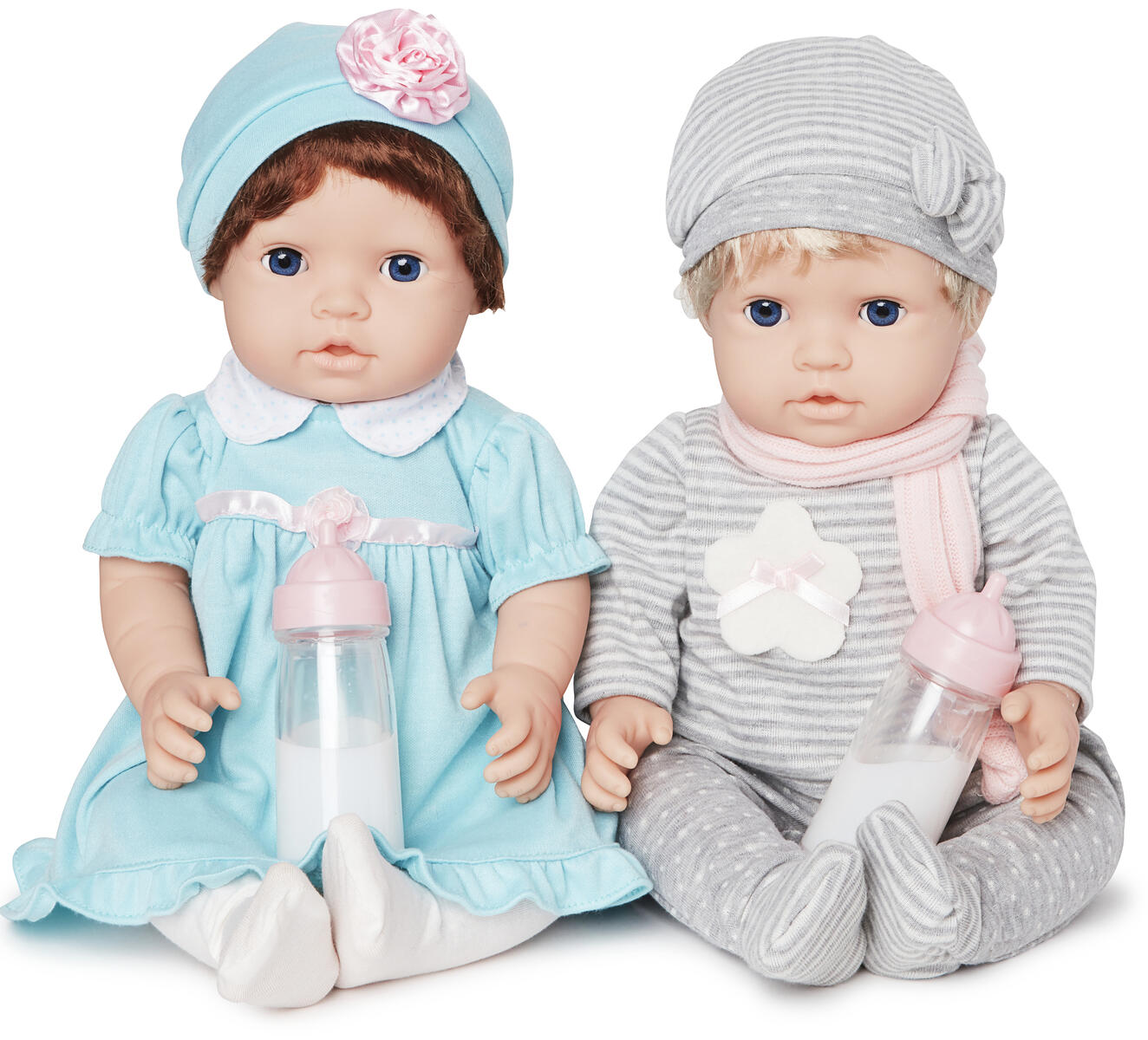 1 st/fp. En större docka med mjukstoppad kropp och beanbag-rumpa. Rörliga armar och ben samt rörliga blundögon. Med blöja och nappflaska. Längd: 43 cm. Armar, ben och huvud av PVC, utan förbjudna ftalater. Blandade modeller. Från 3 år.