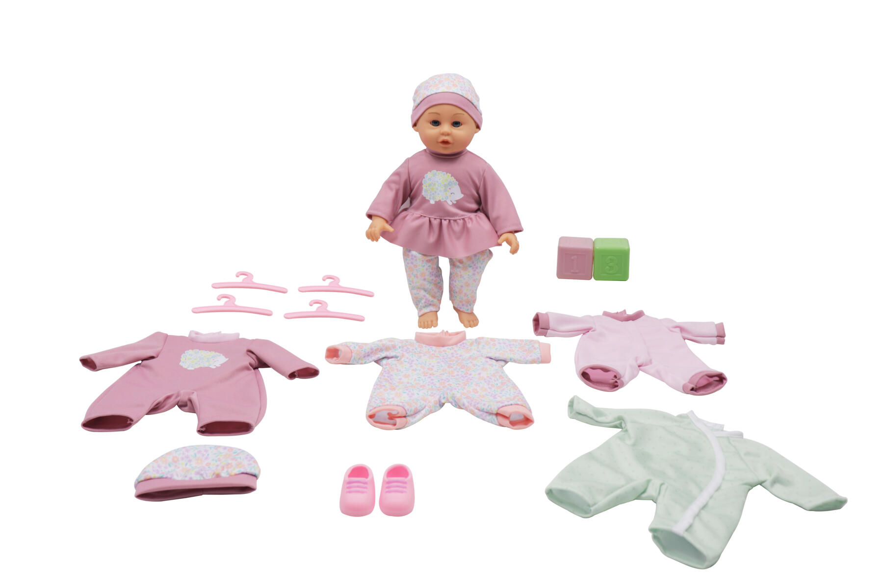 Docka med mjukstoppad kropp, leksaker och 3 extra klädset. Armar, ben och huvud av PVC, utan förbjudna ftalater. Längd 35 cm. Blandade modeller, dubbletter förekommer. Från 2 år.