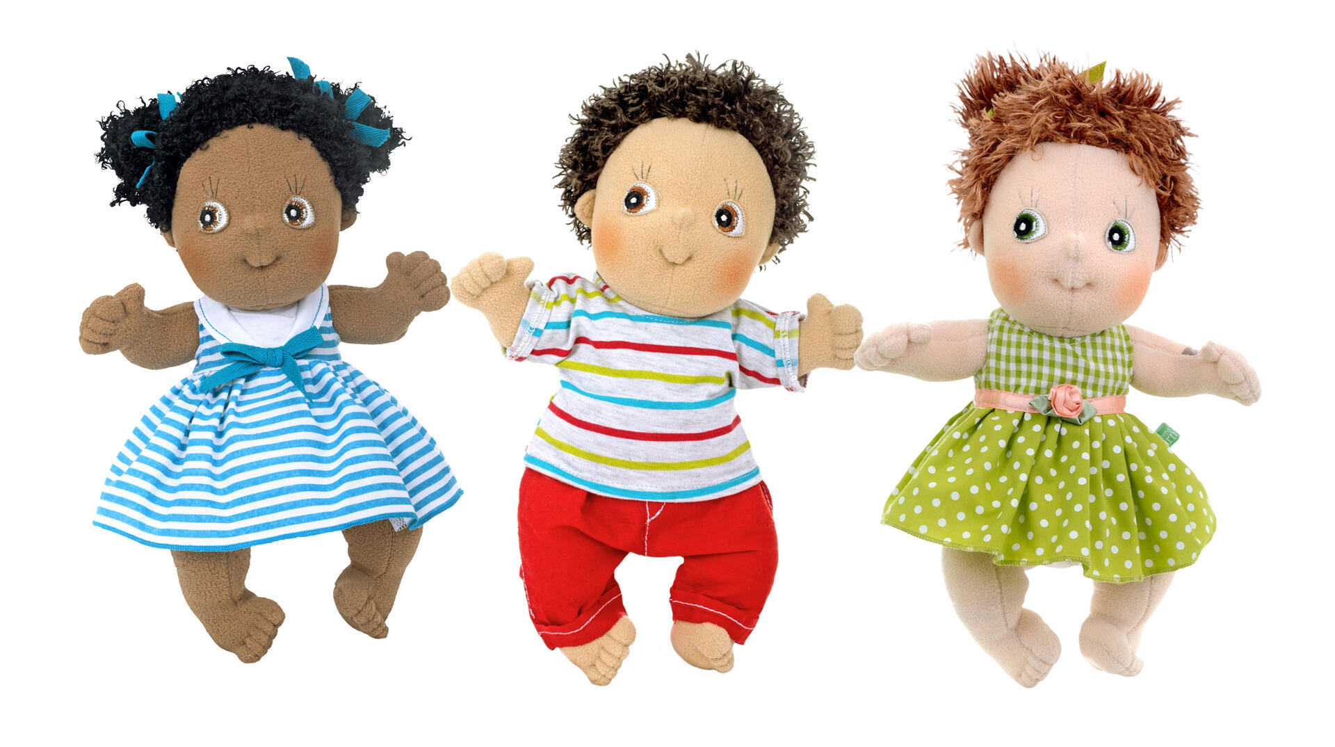 Dockor med verklighetstrogna hudveck och hård kropp. Två flickor och en pojke. Av PVC, utan förbjudna ftalater. Från 3 år.