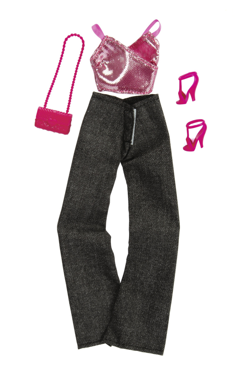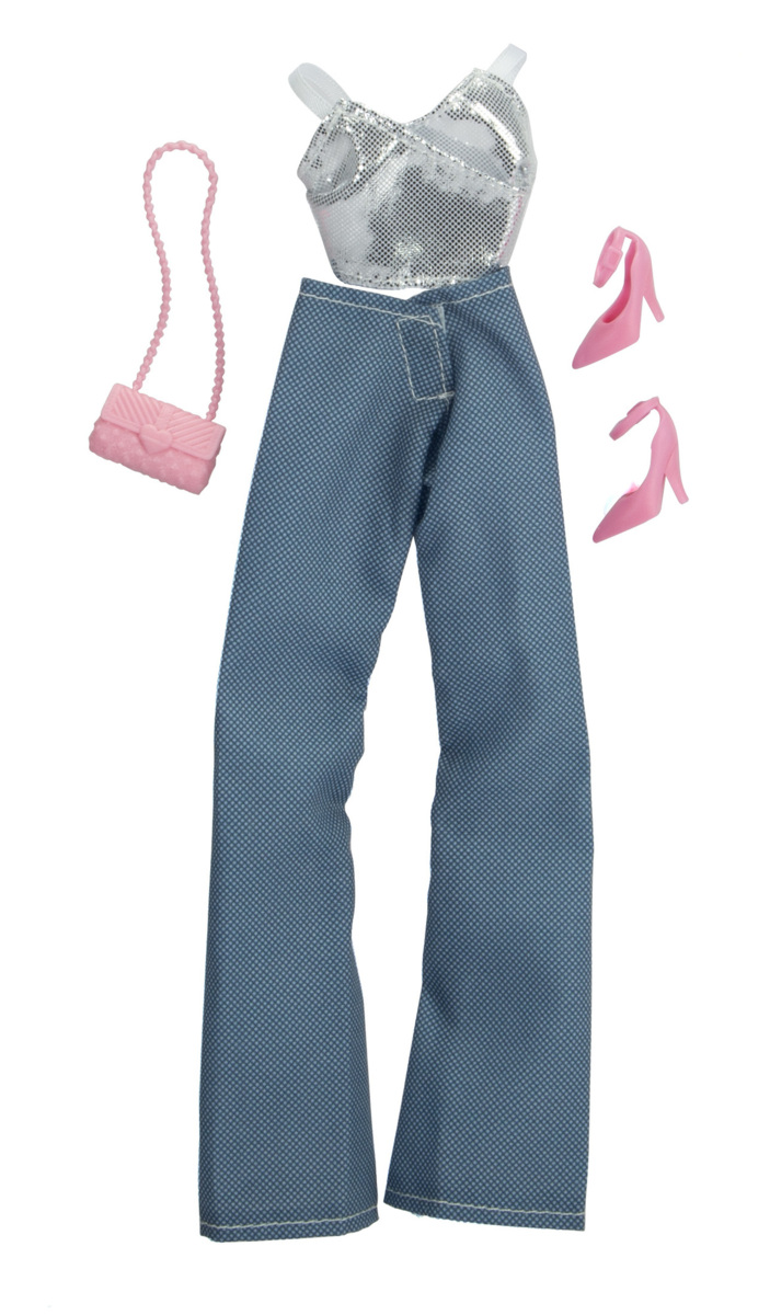 1 st/fp. En snygg glittertopp och jeanstillbehör. Kläderna passar modedockor som är 29 cm långa. Blandade modeller, dubbletter kan förekomma. Docka ingår ej. Av PVC, utan förbjudna ftalater. Från 3 år.