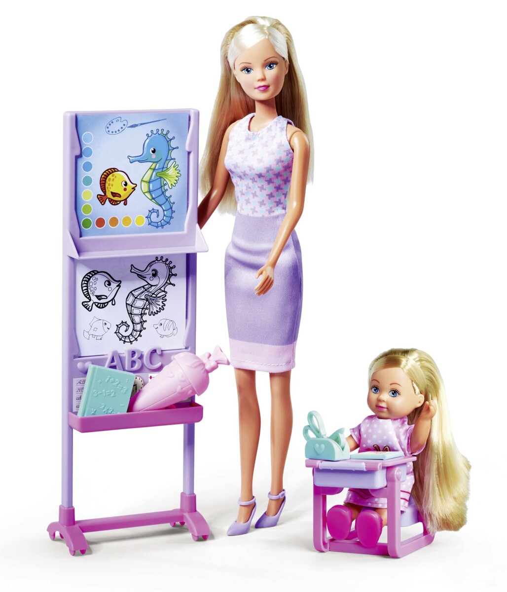 Steffi jobbar som lärare och har Evi som elev. Leksetet innehåller skoltavla, en stol med bord som går att öppna och många tillbehör. Steffi är 29 cm lång och Evi är cirka 12 cm lång. Av PVC, utan förbjudna ftalater. Från 3 år.
