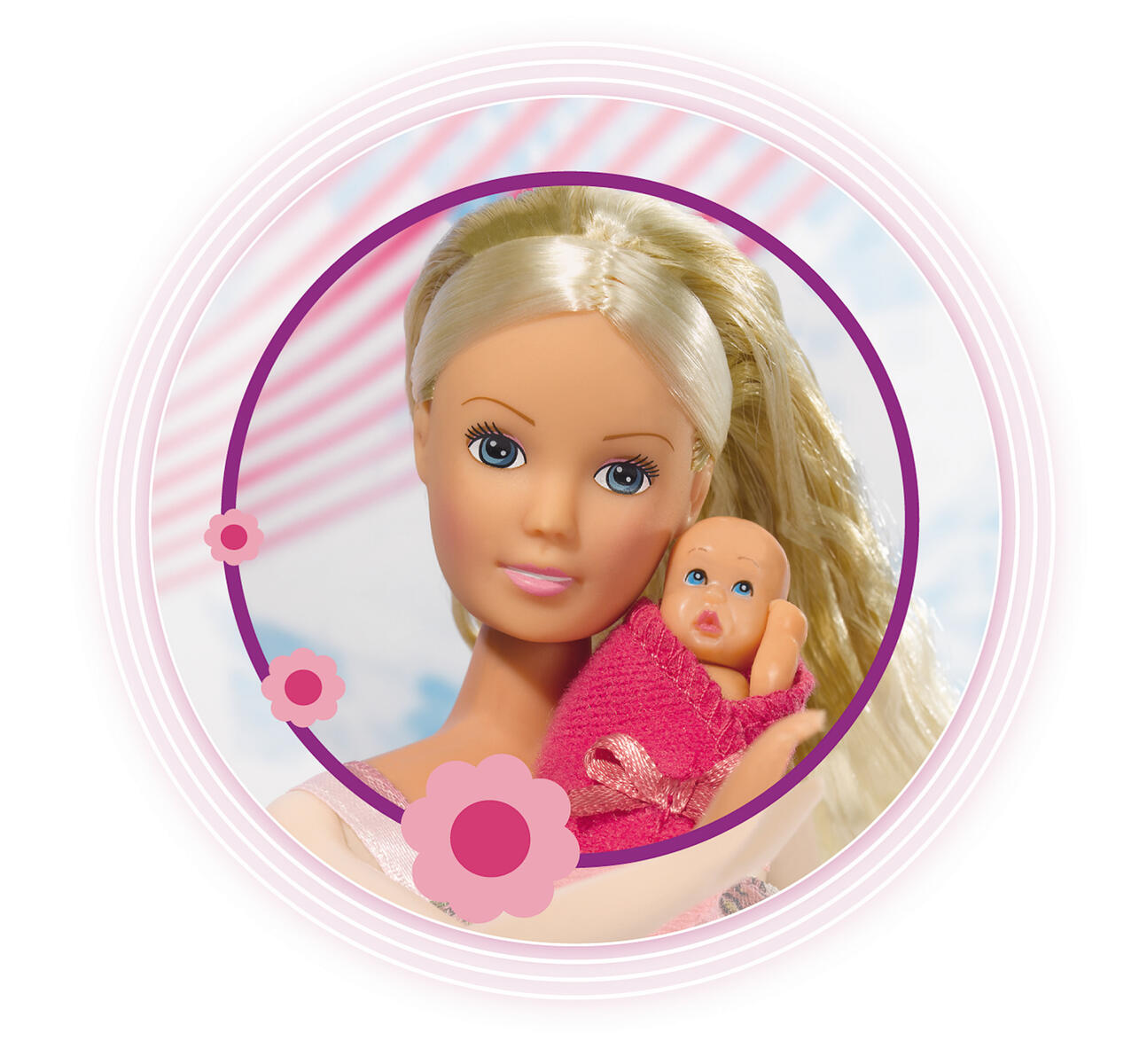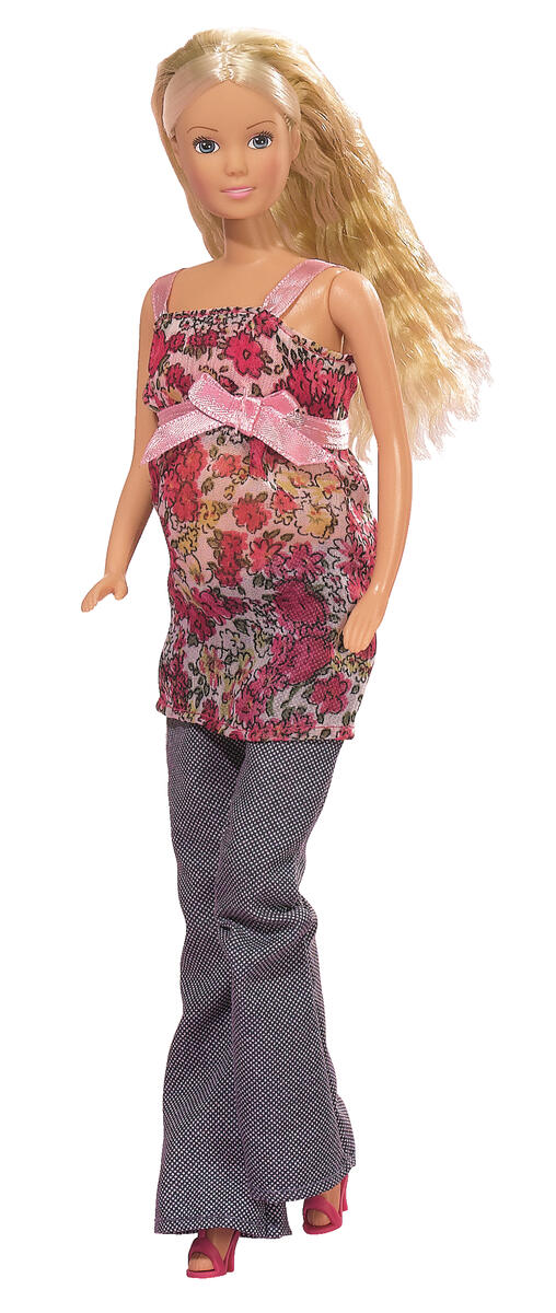 Steffi ska bli mamma. När det är dags för babyn att komma ut kan man enkelt vända magen och ta ut babyn. Innanför finns en vanlig mage som man kan vända fram när Steffi inte längre är gravid. Alla saker som babyn behöver, såsom nappar, leksaker och nappflaskor, följer med. Av PVC, fri från förbjudna ftalater. Från 3 år.