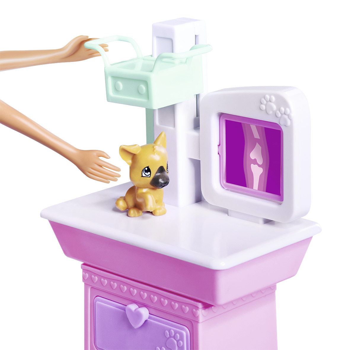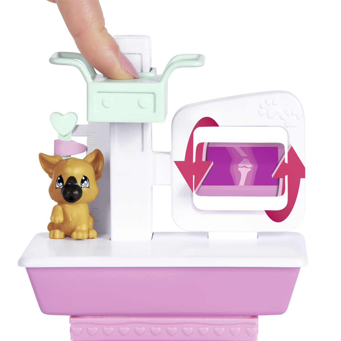 Steffi har fått en hund som patient och hon undersöker den på behandlingsbordet med hjälp av de medföljande tillbehören. Dockan är 29 cm lång. Av PVC, utan förbjudna ftalater. Från 3 år.