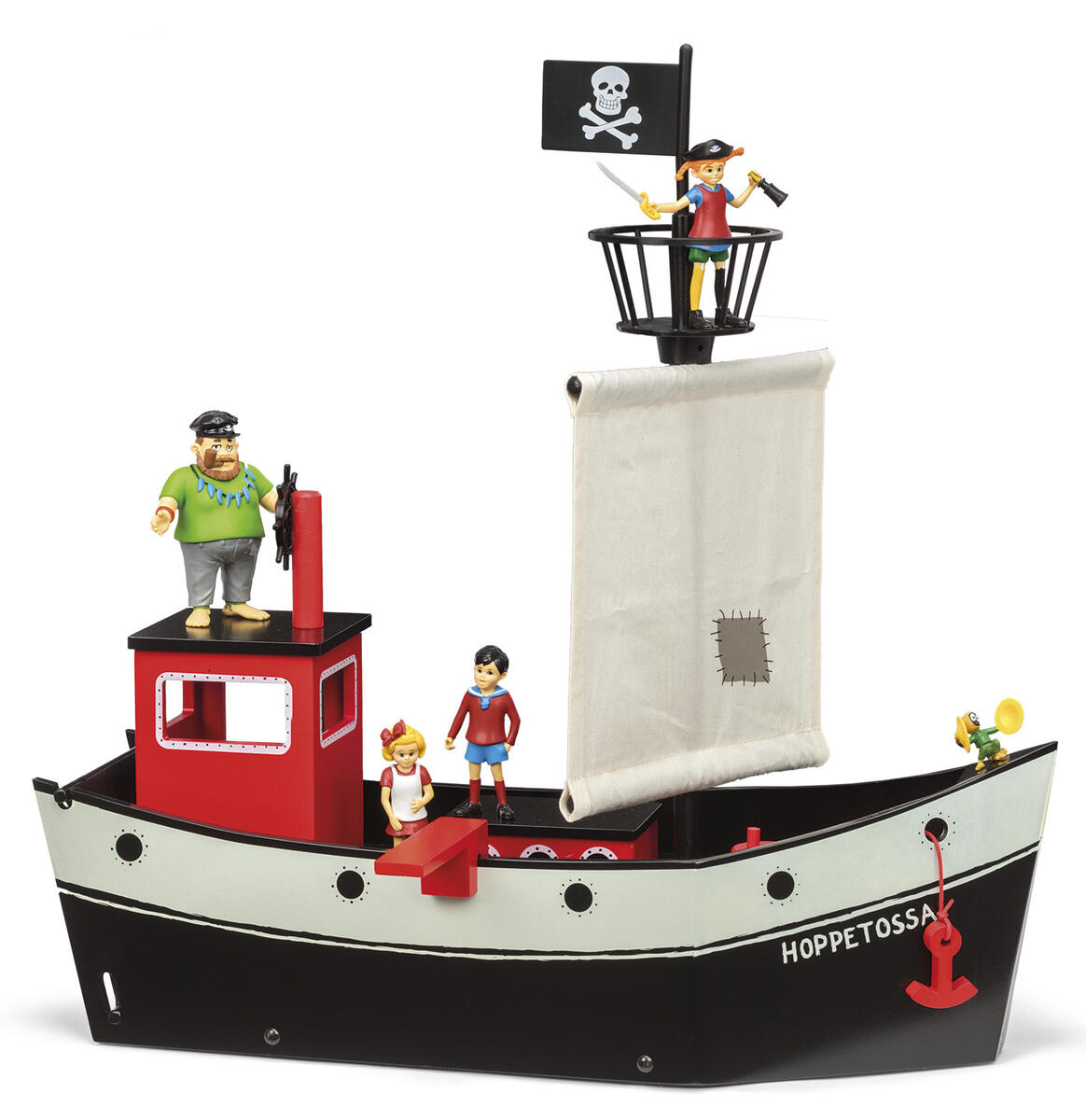 Följ med Pippi och hennes vänner på Pippis pappas piratskepp Hoppetossa! Skeppet är gjort av trämaterial och har många funktioner, t.ex. kan man hissa segel, lyfta locket på lastbrunnen och styrhytten, fälla ner aktern och kasta ankare. Figurer köpes separat (artikel 17245). Av FSC-märkt trä. PVC-fri. Från 3 år.