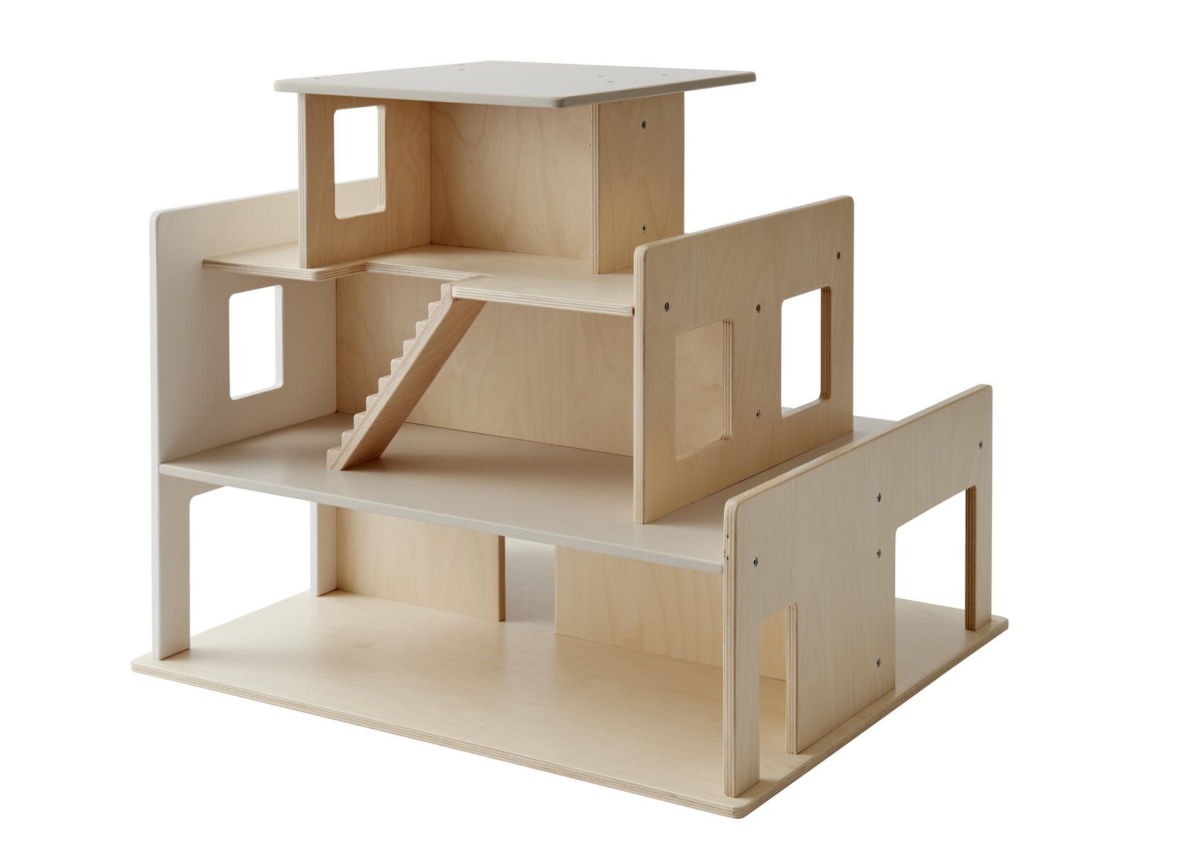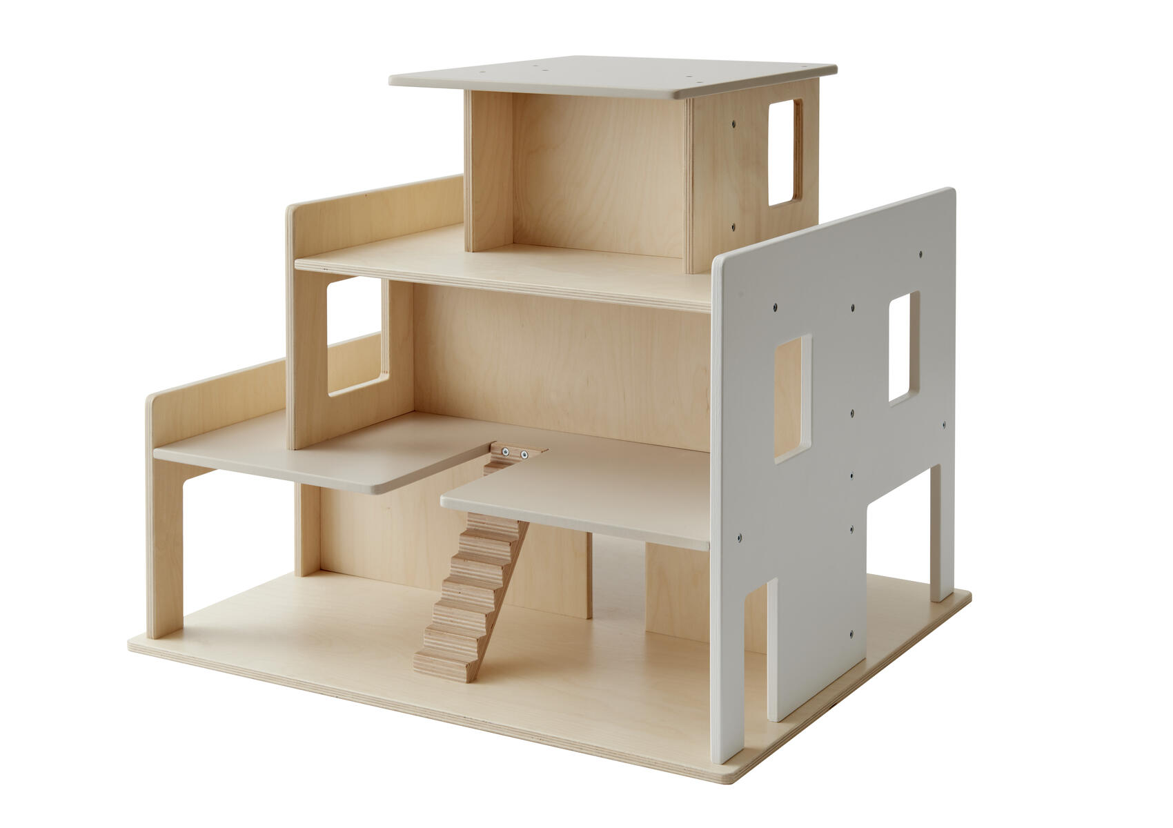 Ett stort dockhus i 3 våningar med modern design. Med stora öppningar som möjliggör lek från flera håll och för många barn samtidigt. Trappa mellan 2 våningar. Levereras färdigmonterat. Dockmöbler ingår ej. Av lackerad FSC-godkänd plywood. Mått: 64x54x54 cm. Svanenmärkt, licensnummer 5095 0005. PVC-fri. Från 2 år.