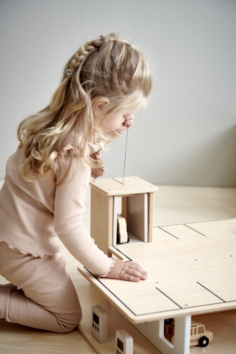Ett parkeringshus i 2 våningar med mild färgsättning. Öppet från alla håll så att flera barn kan leka samtidigt. Med hiss, ramp mellan våningarna, bensinpumpar och tryckta markeringar för parkeringsplatser. Behöver du plats för fler bilar är parkeringshuset kompatibelt med parkeringshus stort och litet. Levereras färdigmonterat. Av kraftig, lackerad FSC-godkänd plywood. Svanenmärkt, licensnummer 5095 0005. PVC-fri. Från 3 år.