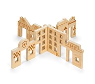 Med denna stad bjuds kreativ lek i oändlighet. Bygg din egen stad med de 26 olika delarna. Här finns t.ex. brandstation, stormarknad, polisstation och skola. Delarna sätts enkelt ihop. Komplettera gärna med 12056, Människorna i staden, för att skapa mer liv. Trädelarna är gjorda av FSC-märkt lindträ i hög kvalitet. PVC-fri. Från 2 år.